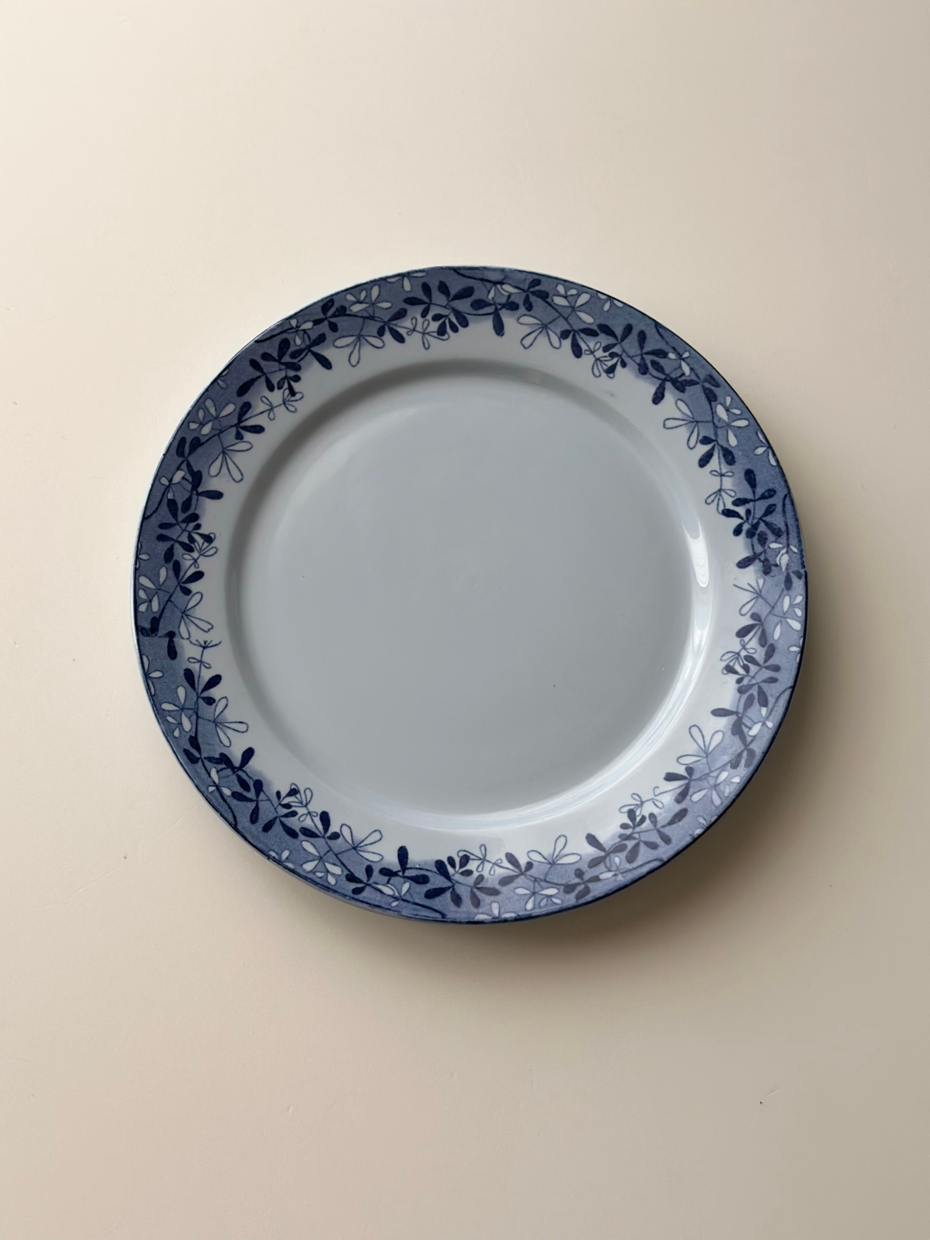 やわらかな水色の地に、ミモザの葉を思わせる繊細なリース模様が描かれた1枚。