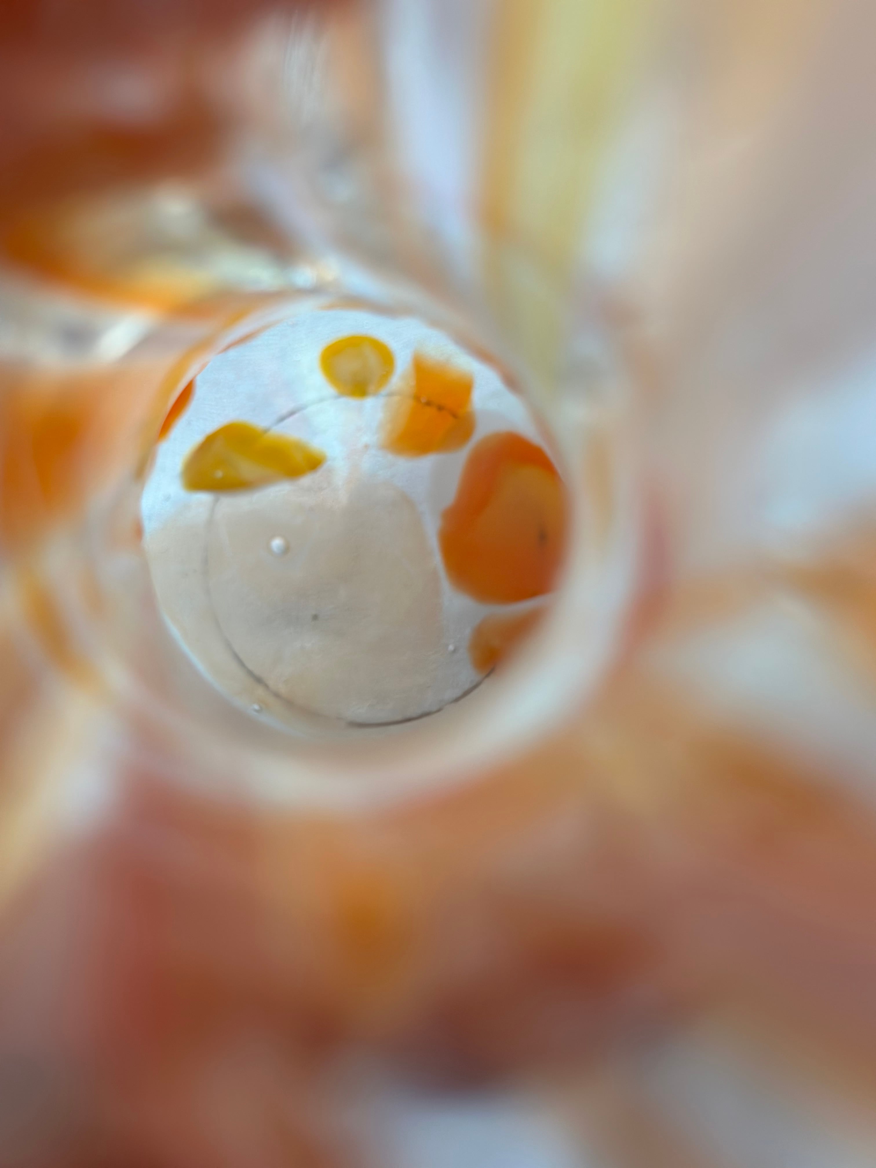 透明ガラスにオレンジやイエロー、ホワイトが溶け合い、炎のように揺らめくマーブル模様が広がります。