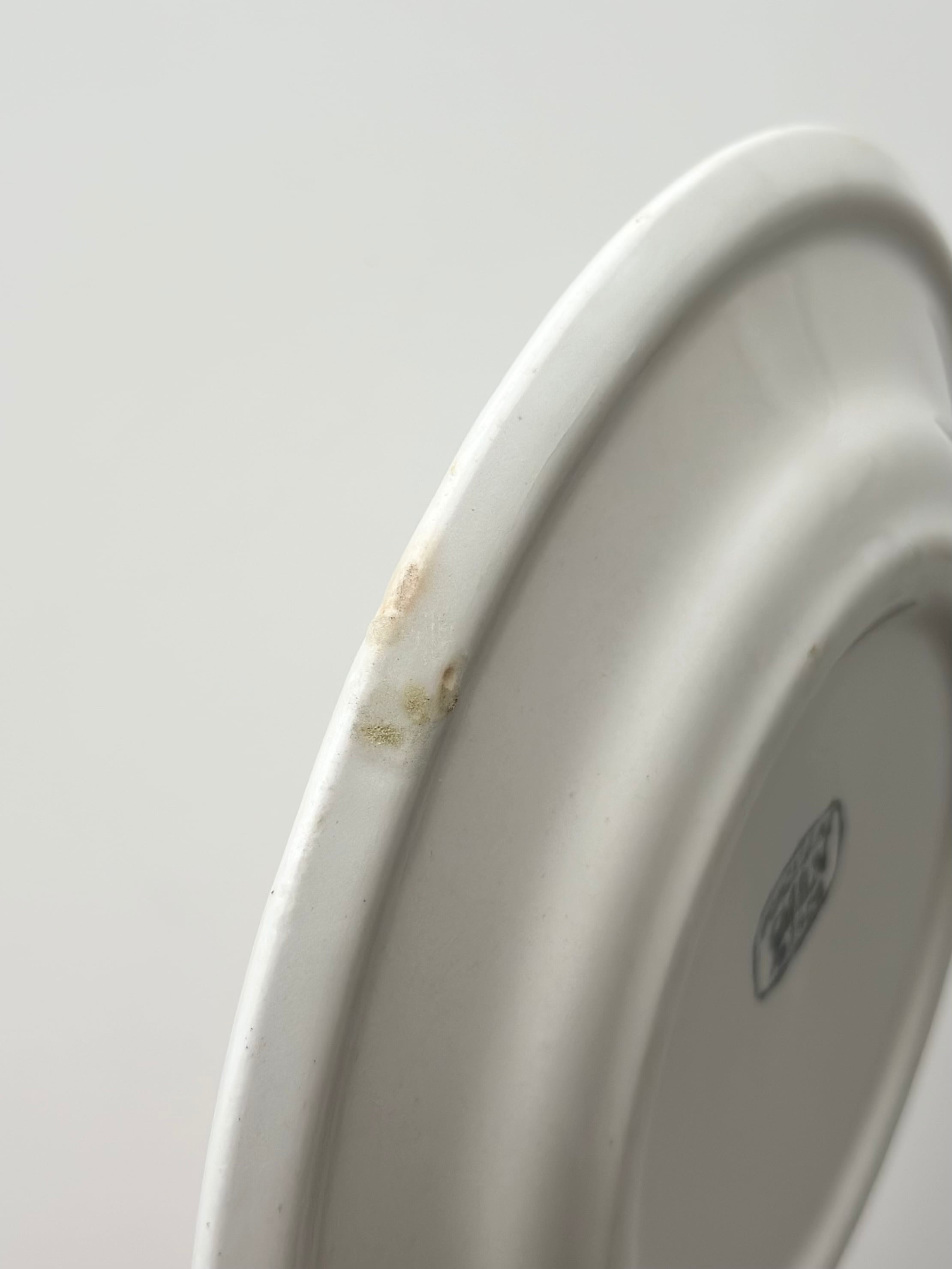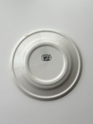condition: 表面インク飛びあり、ややカトラリーキズあるものの艶やかな美品です。裏面縁に窯傷あり。