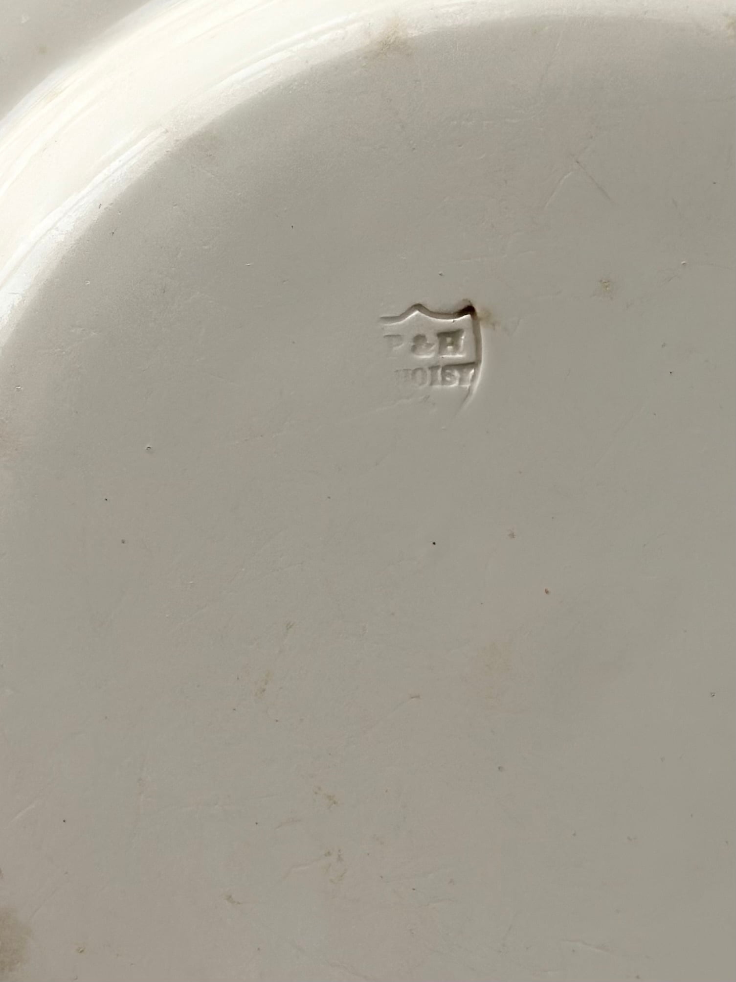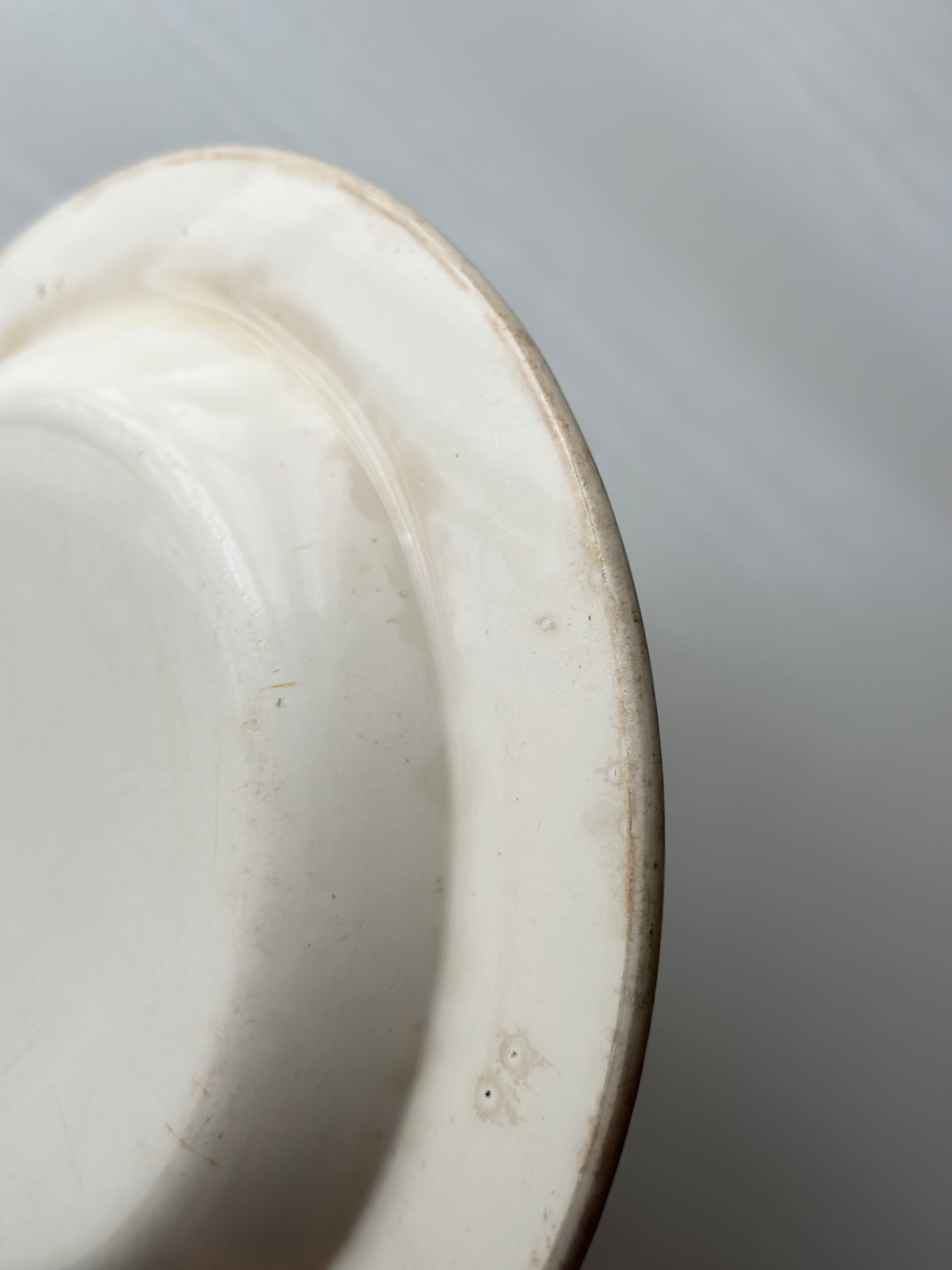 condition: 表面カトラリーキズあるものの目立つヒビやカケもなし。表面縁に小さなチップや擦れキズあり。見込み部分滲みあり。年代を鑑みても大変良いコンディション。古手の1枚です。裏面エッジ周り滲みや擦れあり。
