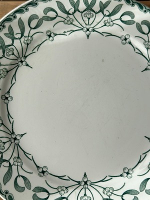 淡いグリーンで描かれた繊細なヤドリギ模様がリムを囲み、