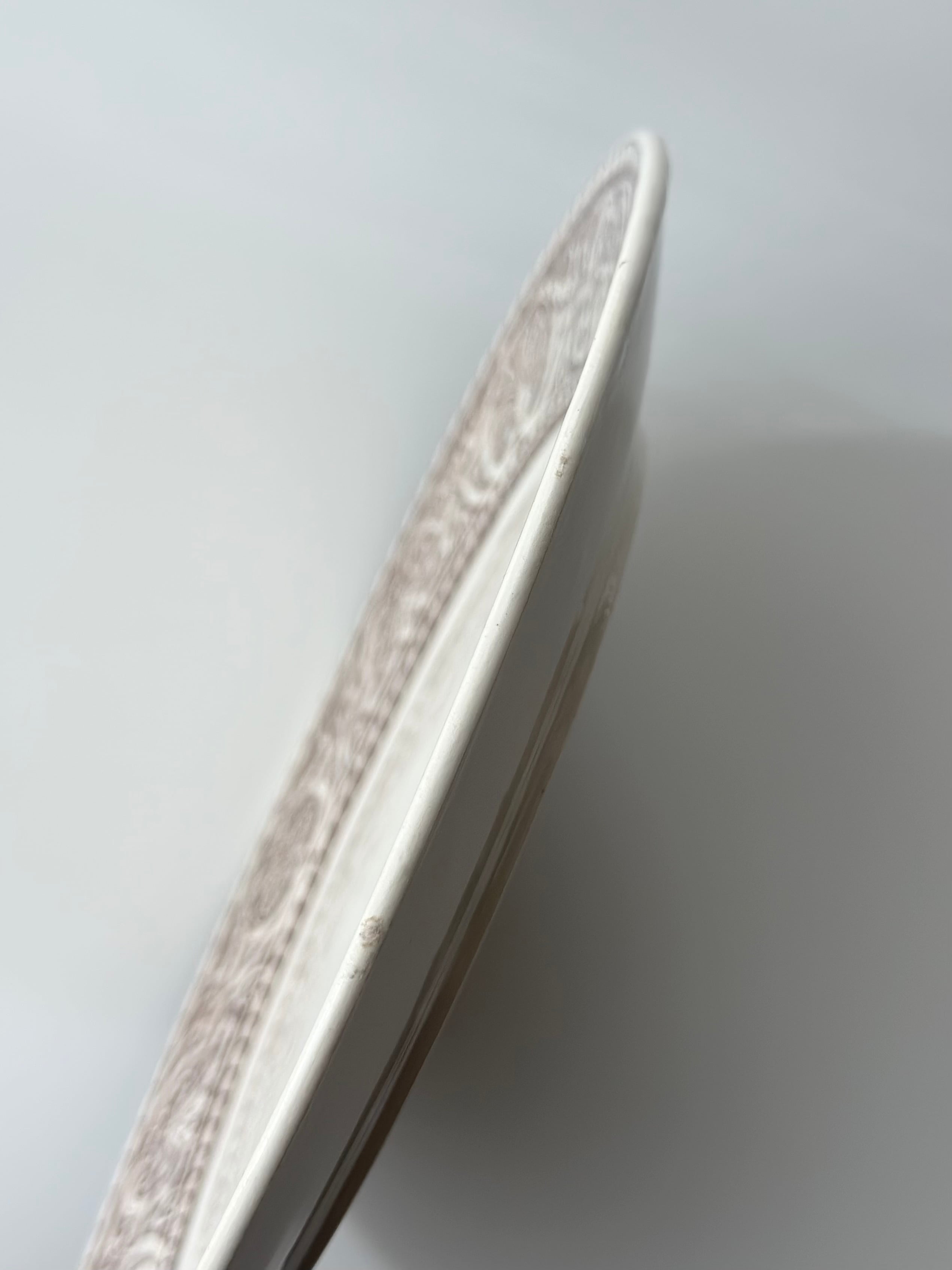 このプレートの縁を飾るアラベスク模様やアカンサスの葉、そして紋章を思わせる構成は、まさにその時代の美意識を写したもの。