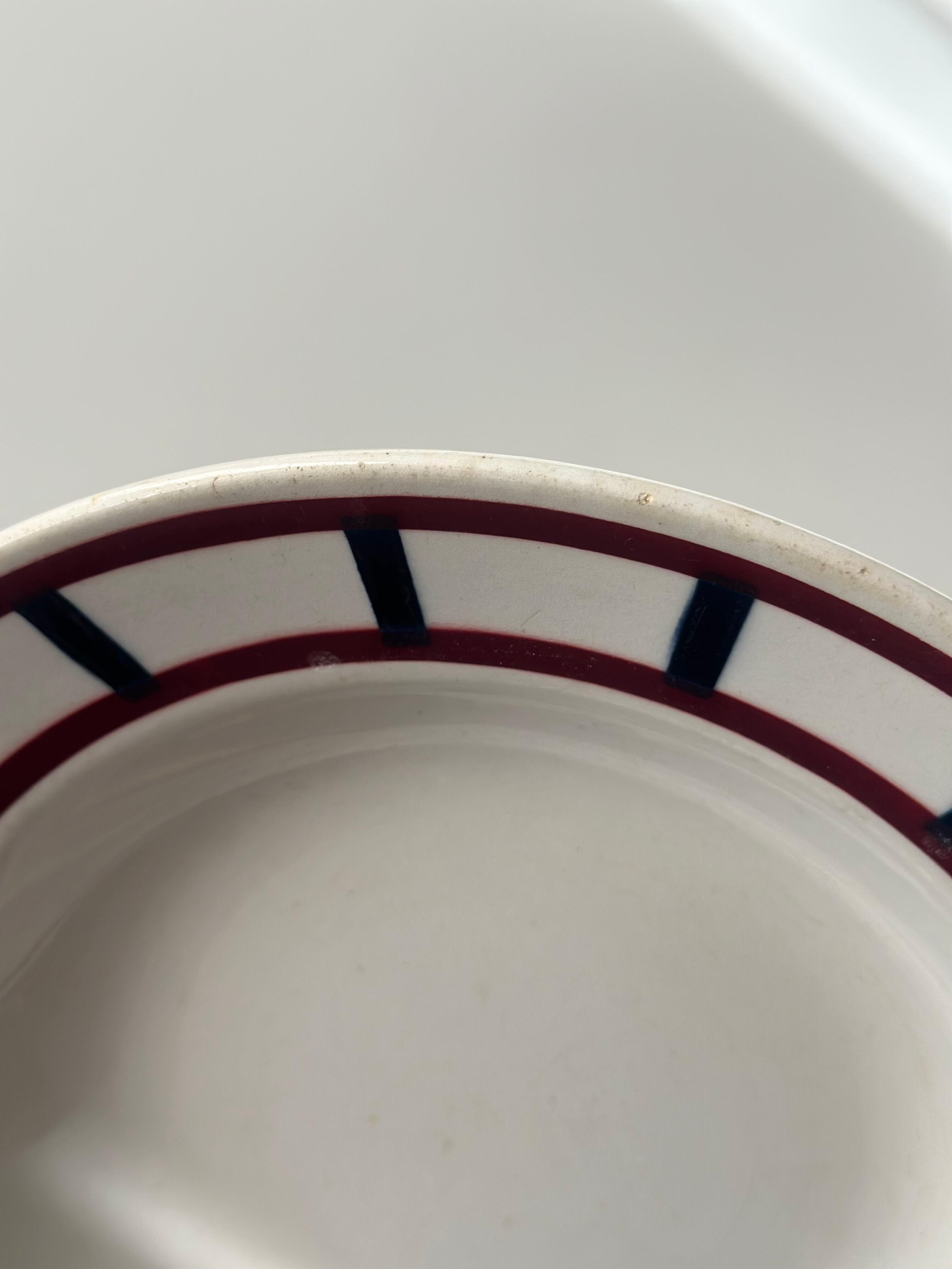 白の陶肌に赤と青のトリコロール模様がくっきりと映えて、