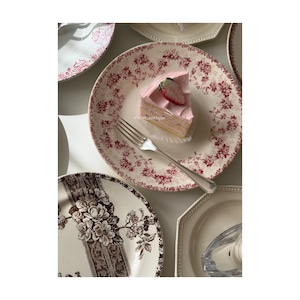 赤みがかったボルドー色で、リムのまわりいっぱいに小花が連なった、