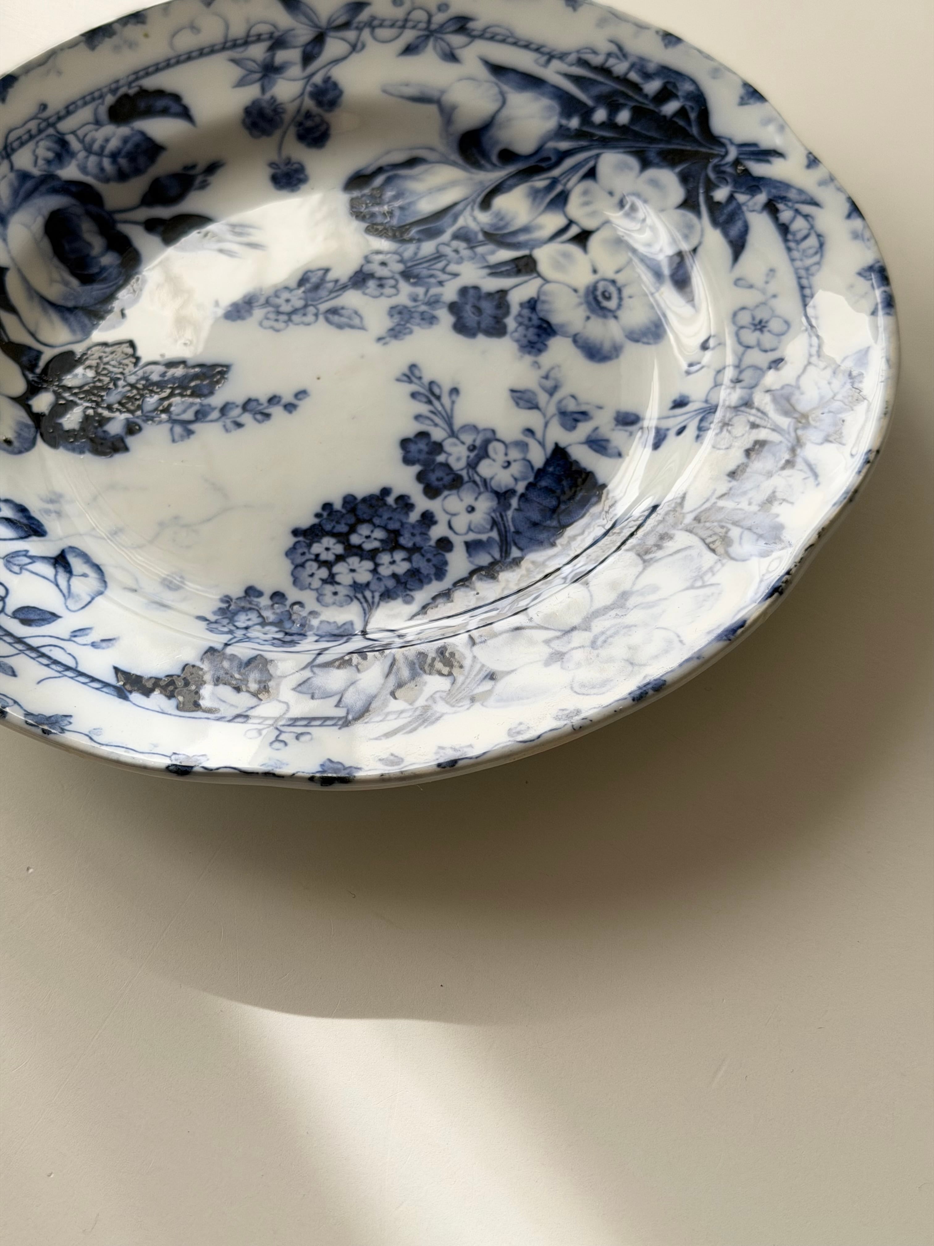 深いコバルトブルーで描かれた花々が、白地の余白に美しく映える1枚です。