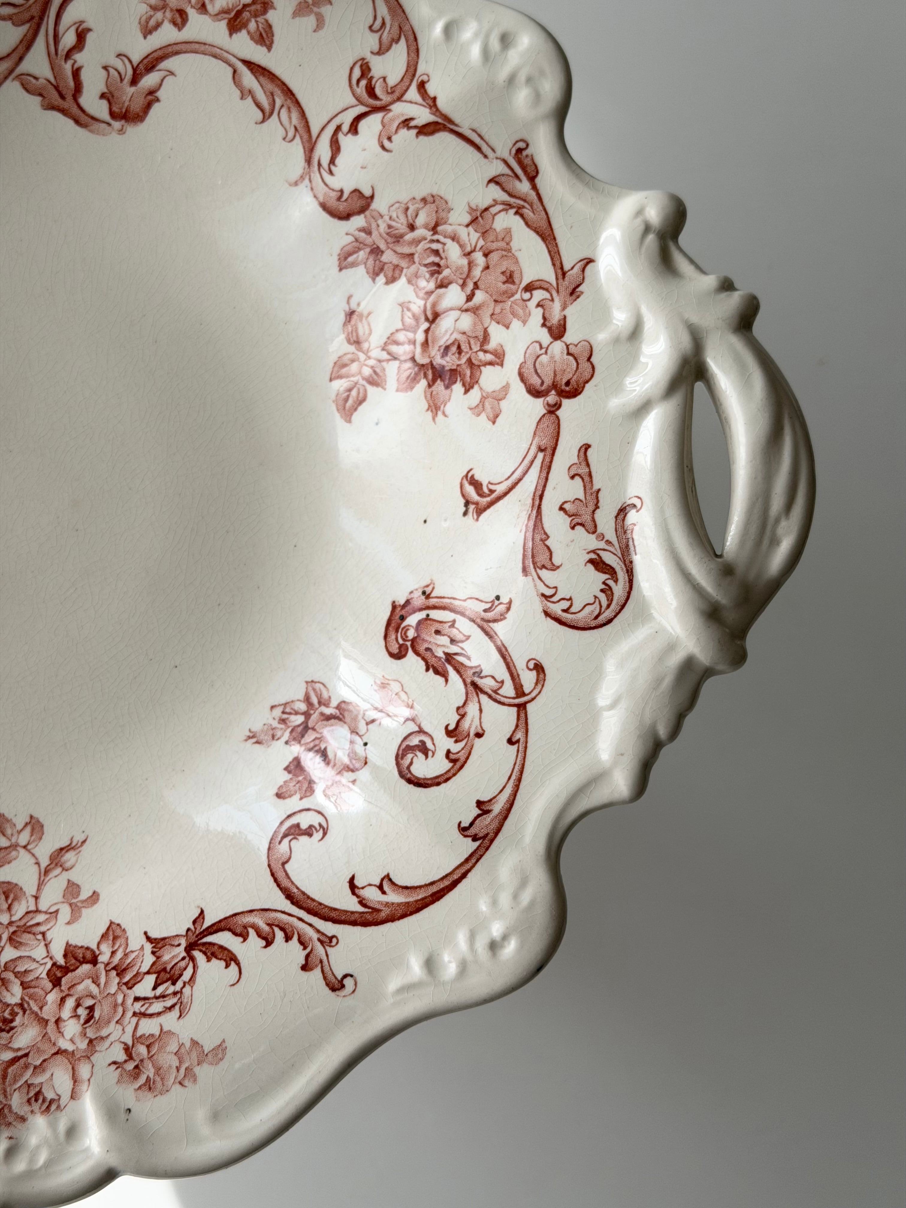 優しいアイボリーの陶肌に赤茶色で描かれた優雅なフローラルガーランド。