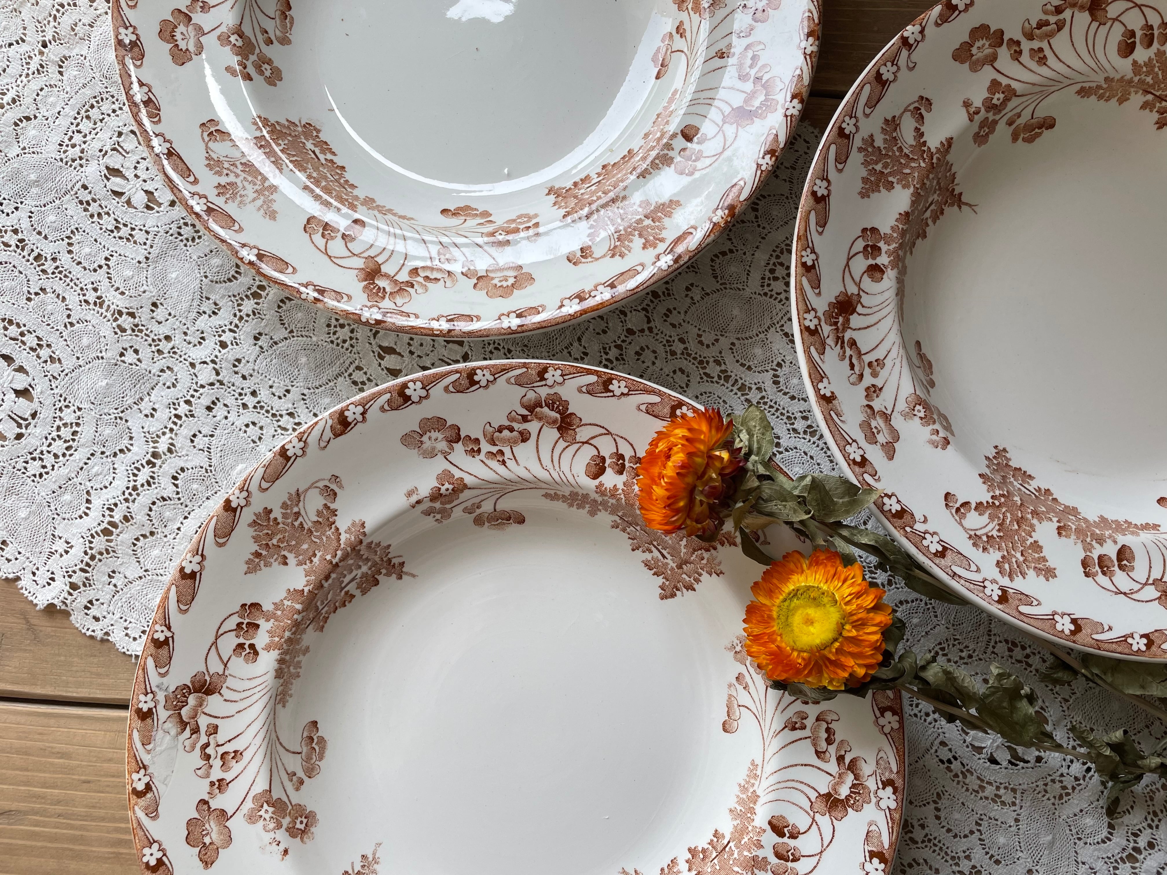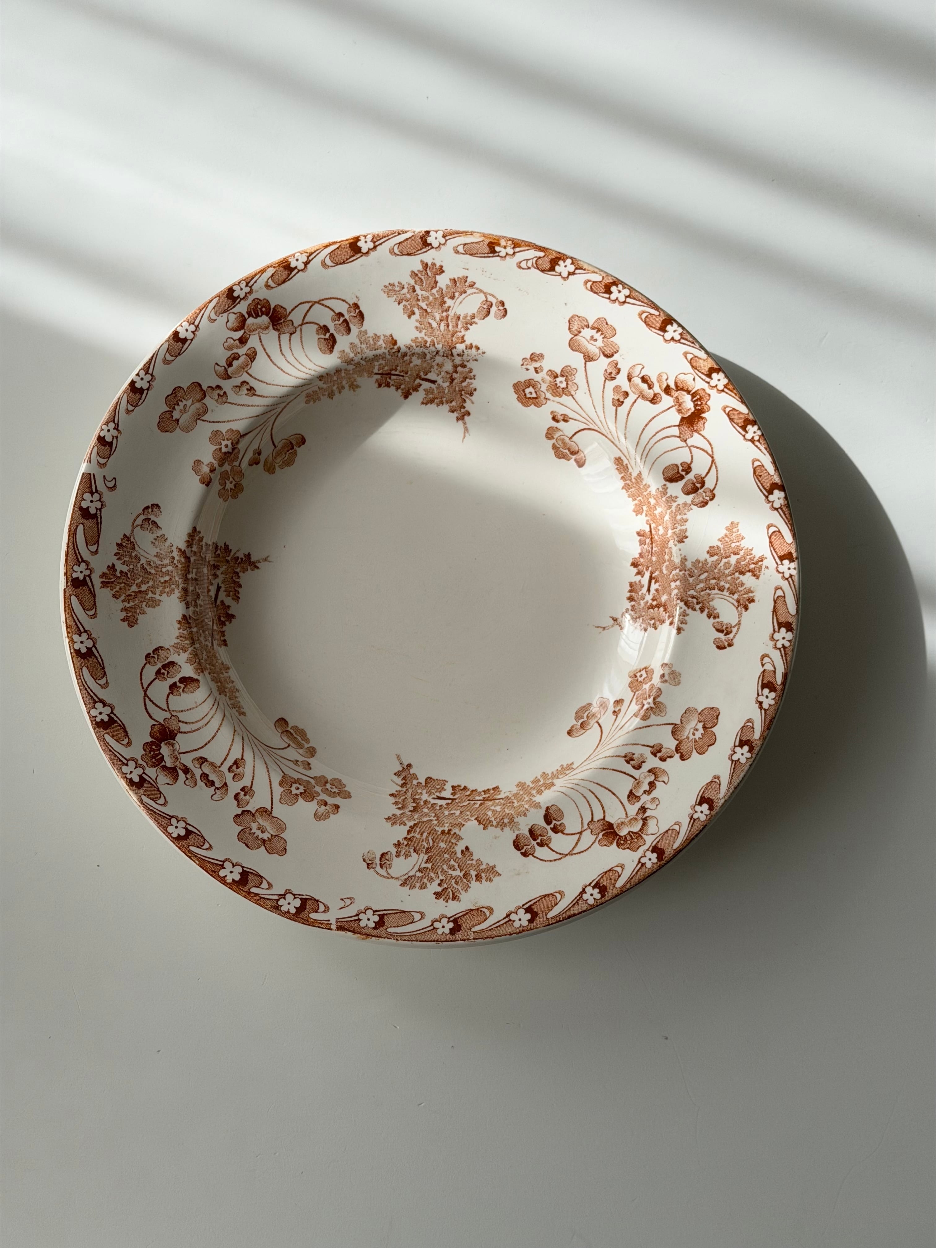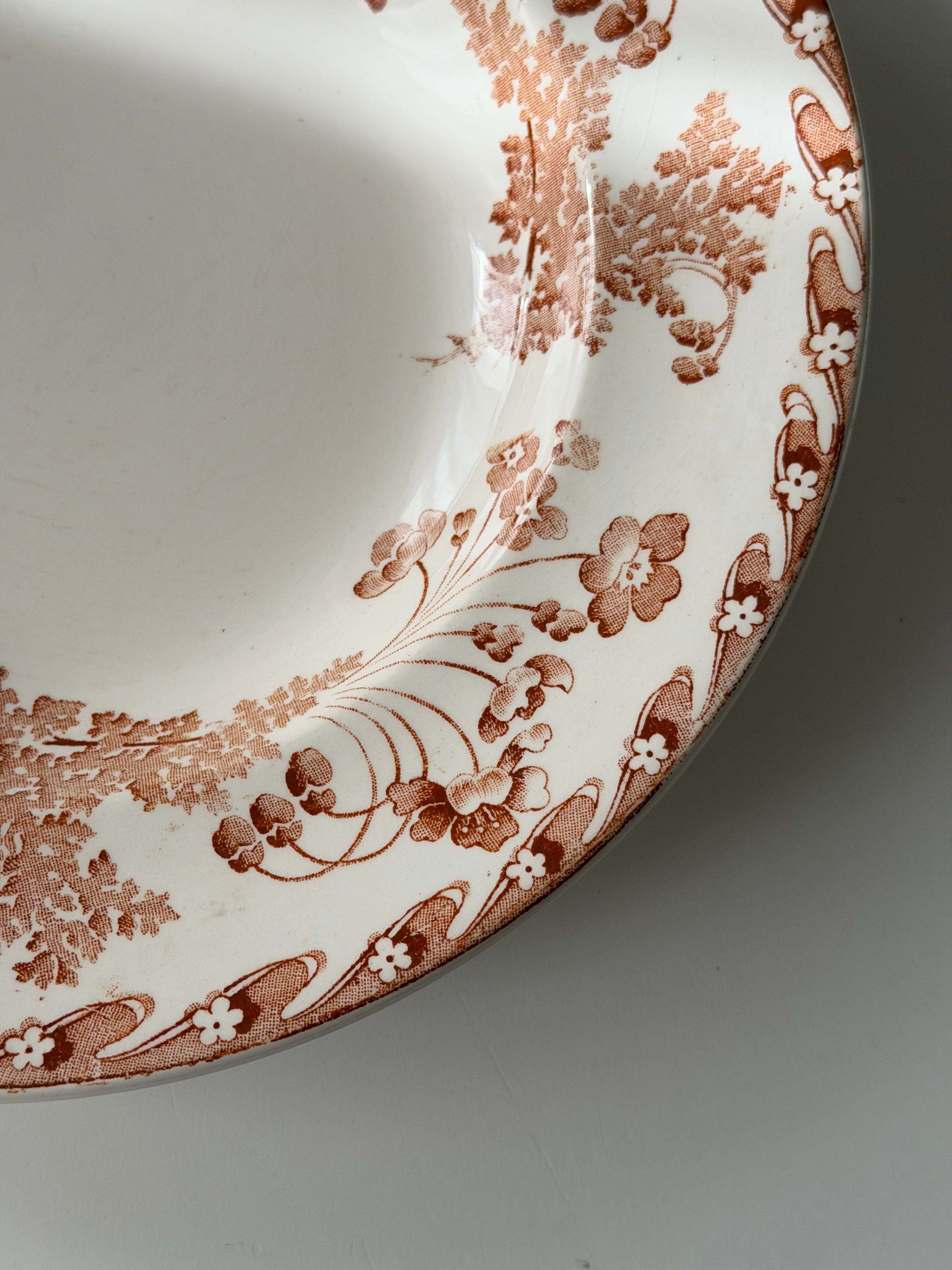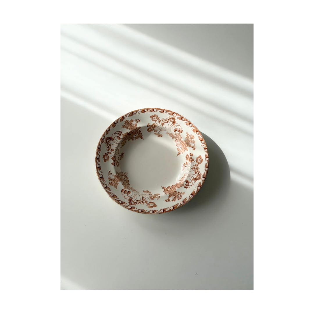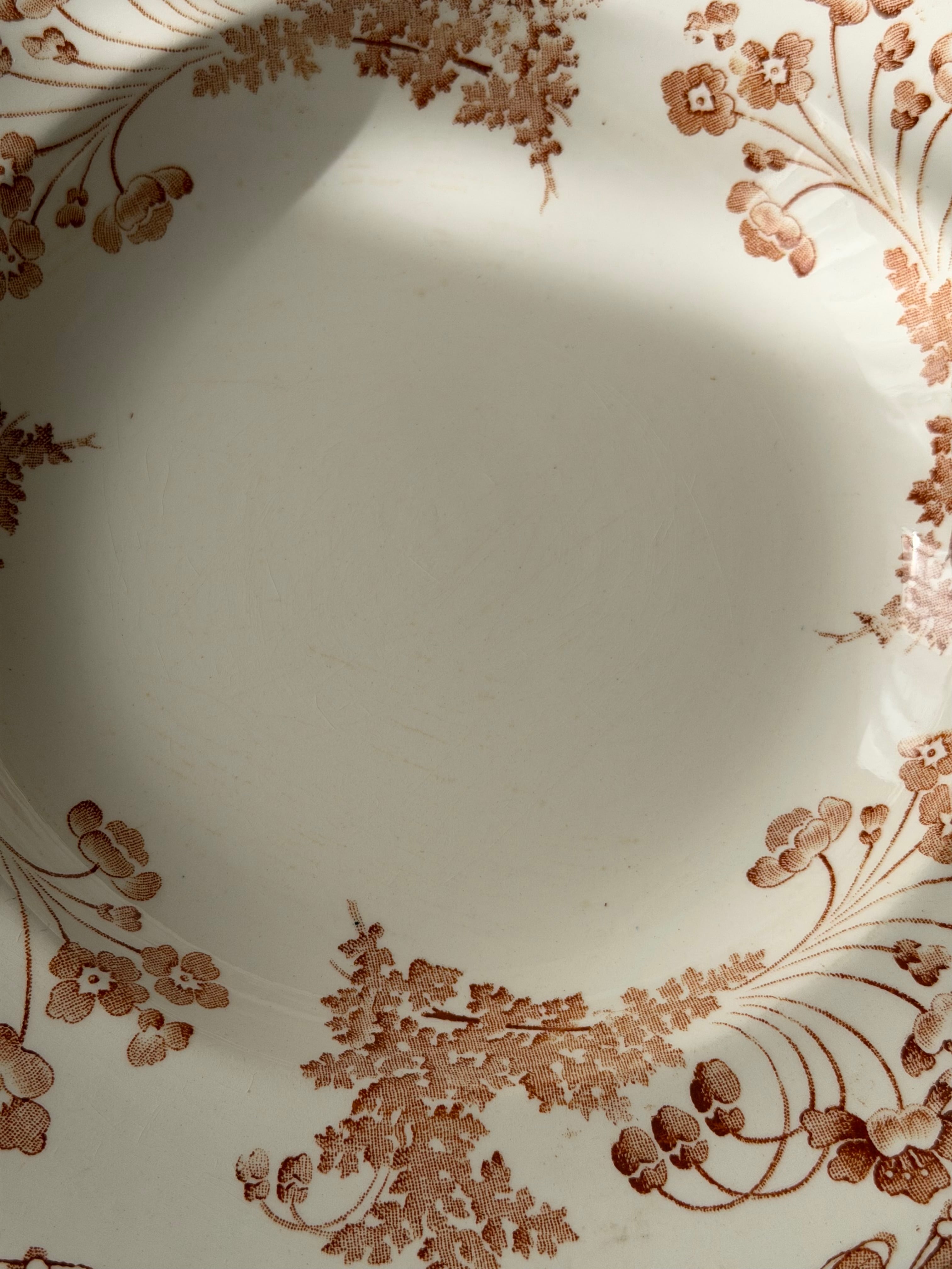 温かみのあるオレンジブラウンで描かれた草花文様が、