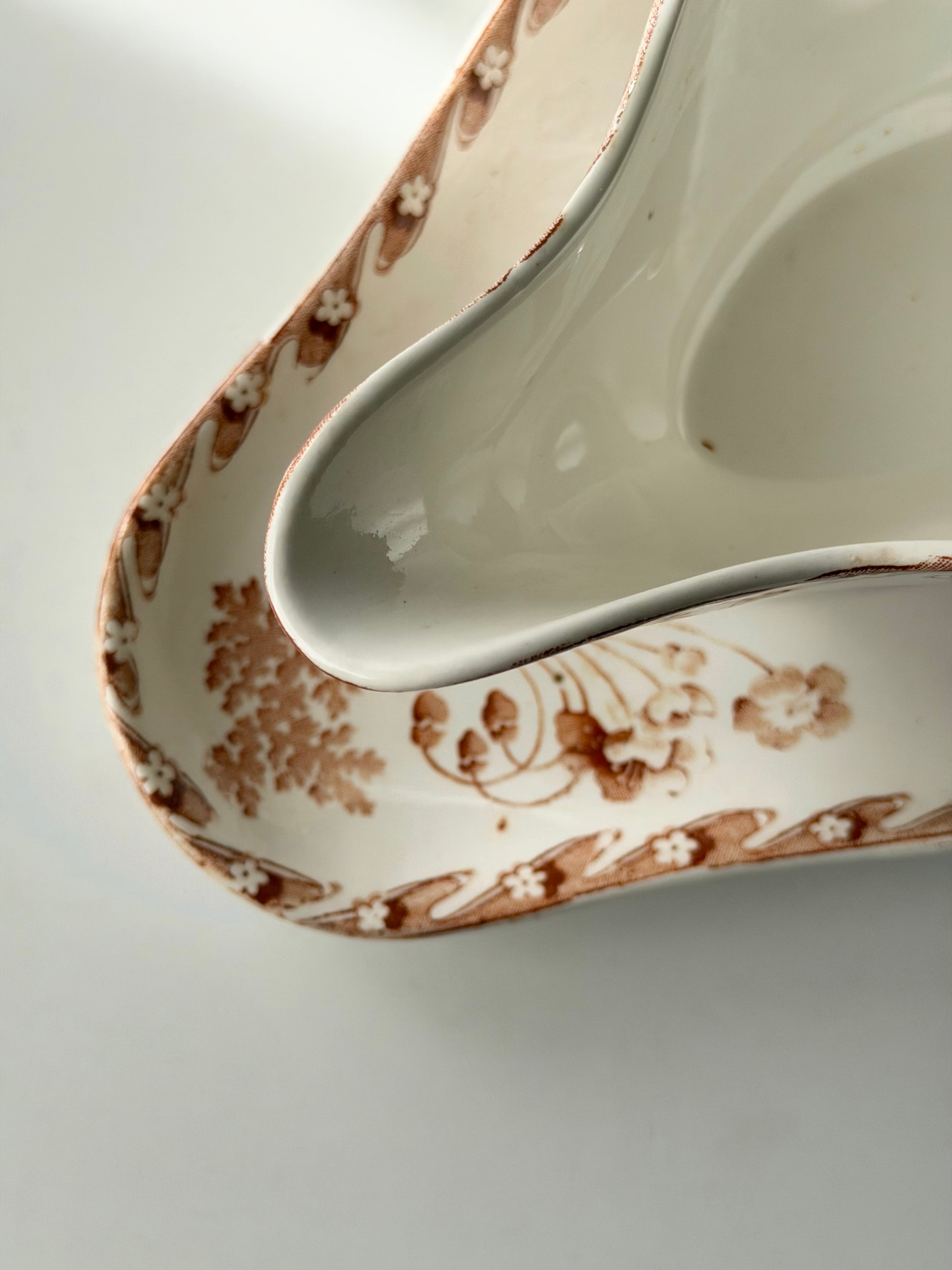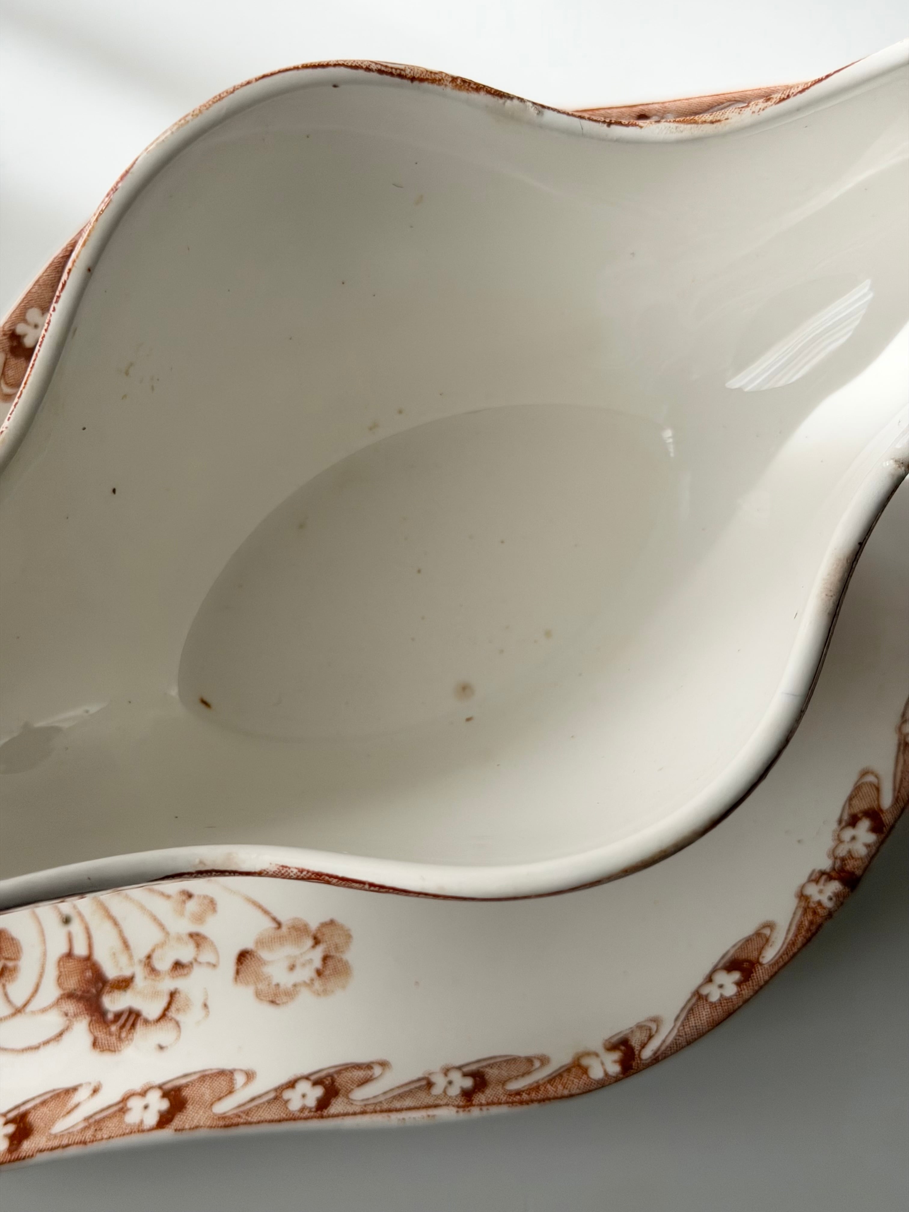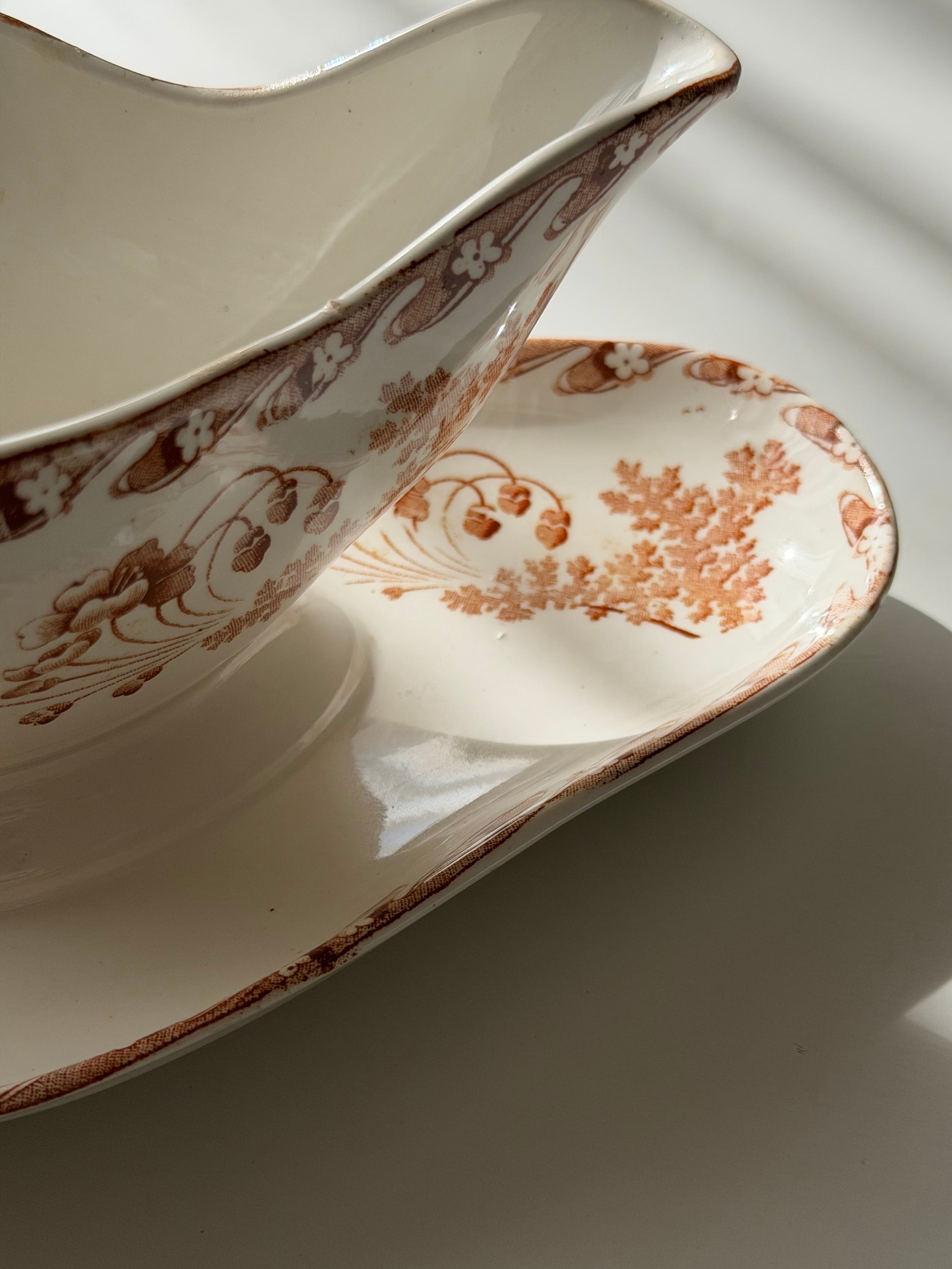 温かみのあるオレンジブラウンで描かれた草花文様が、