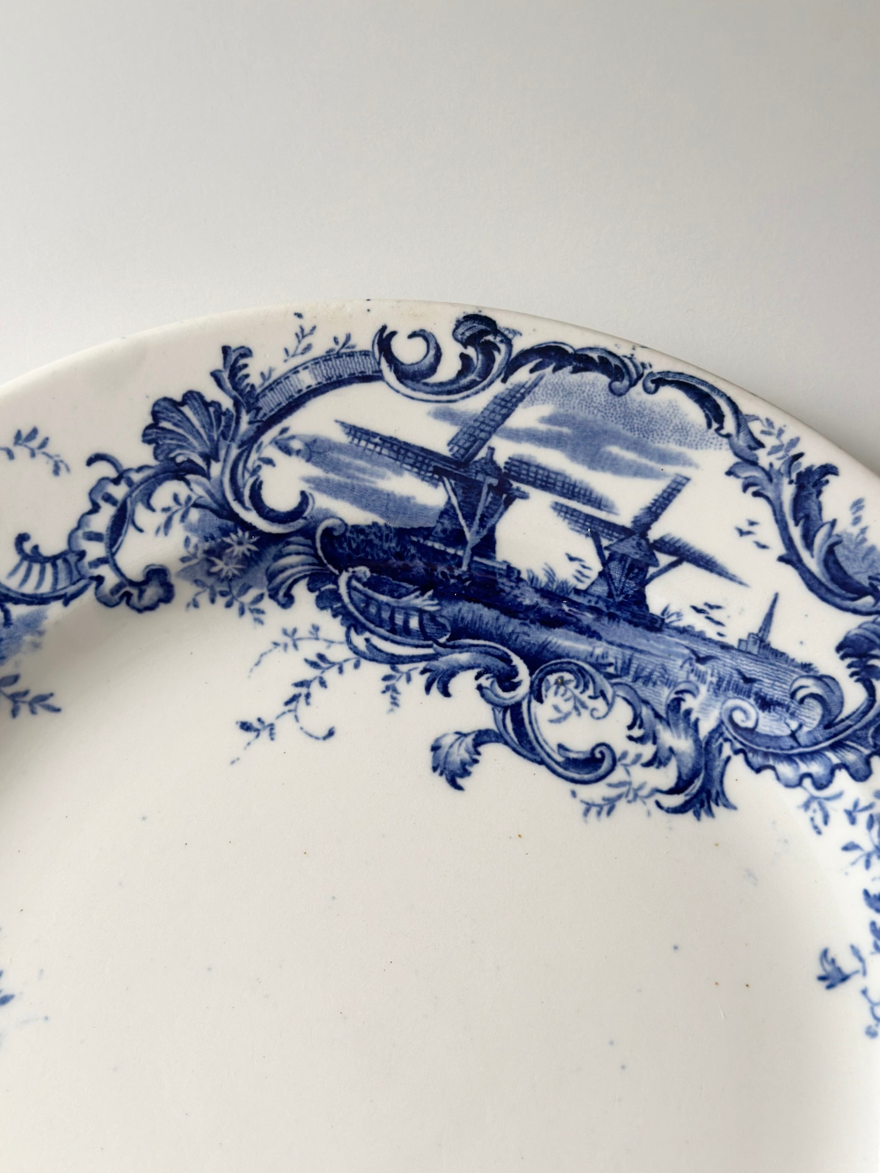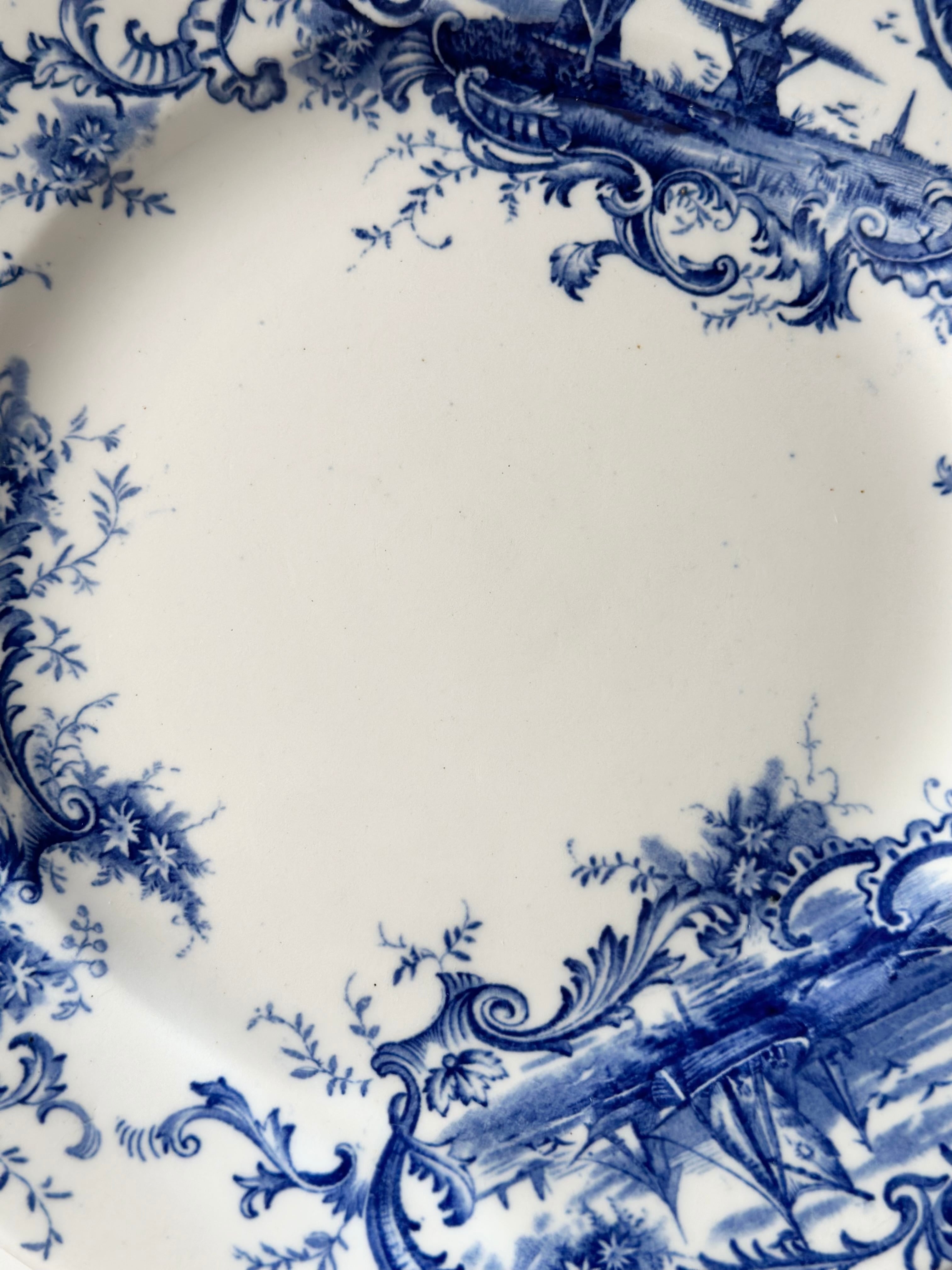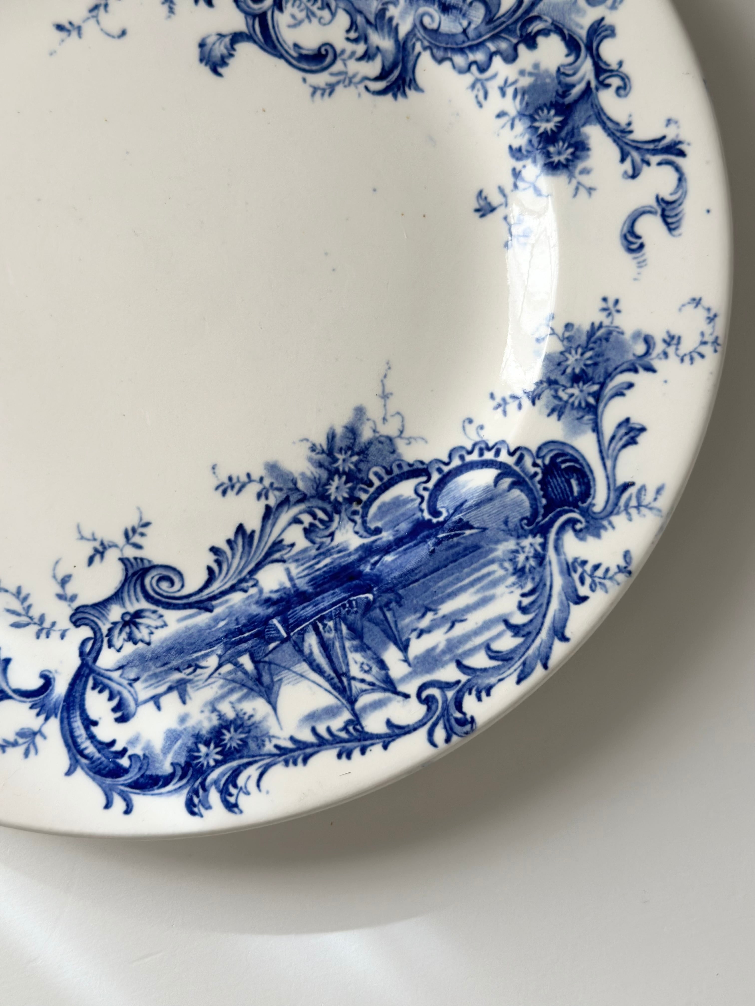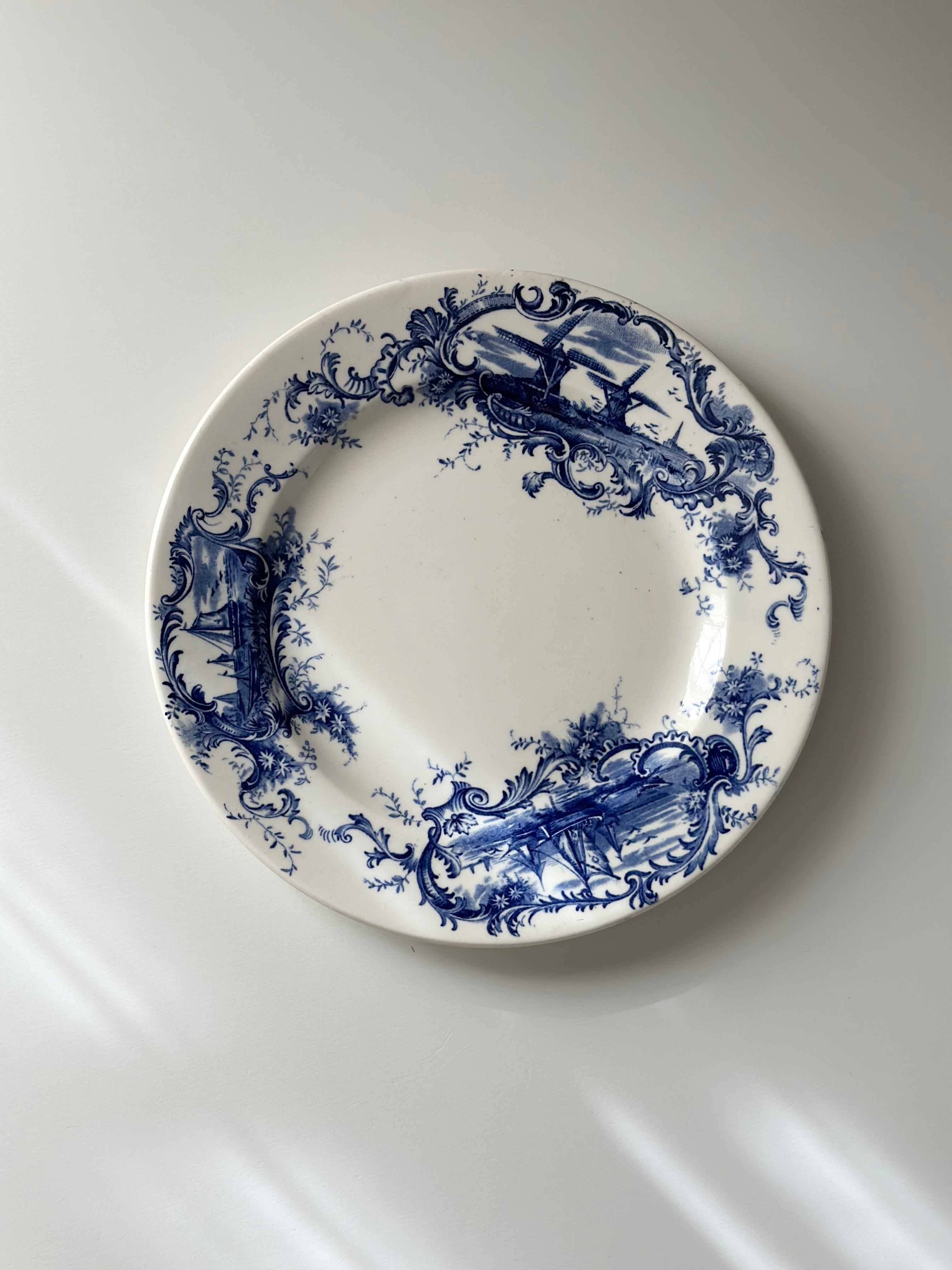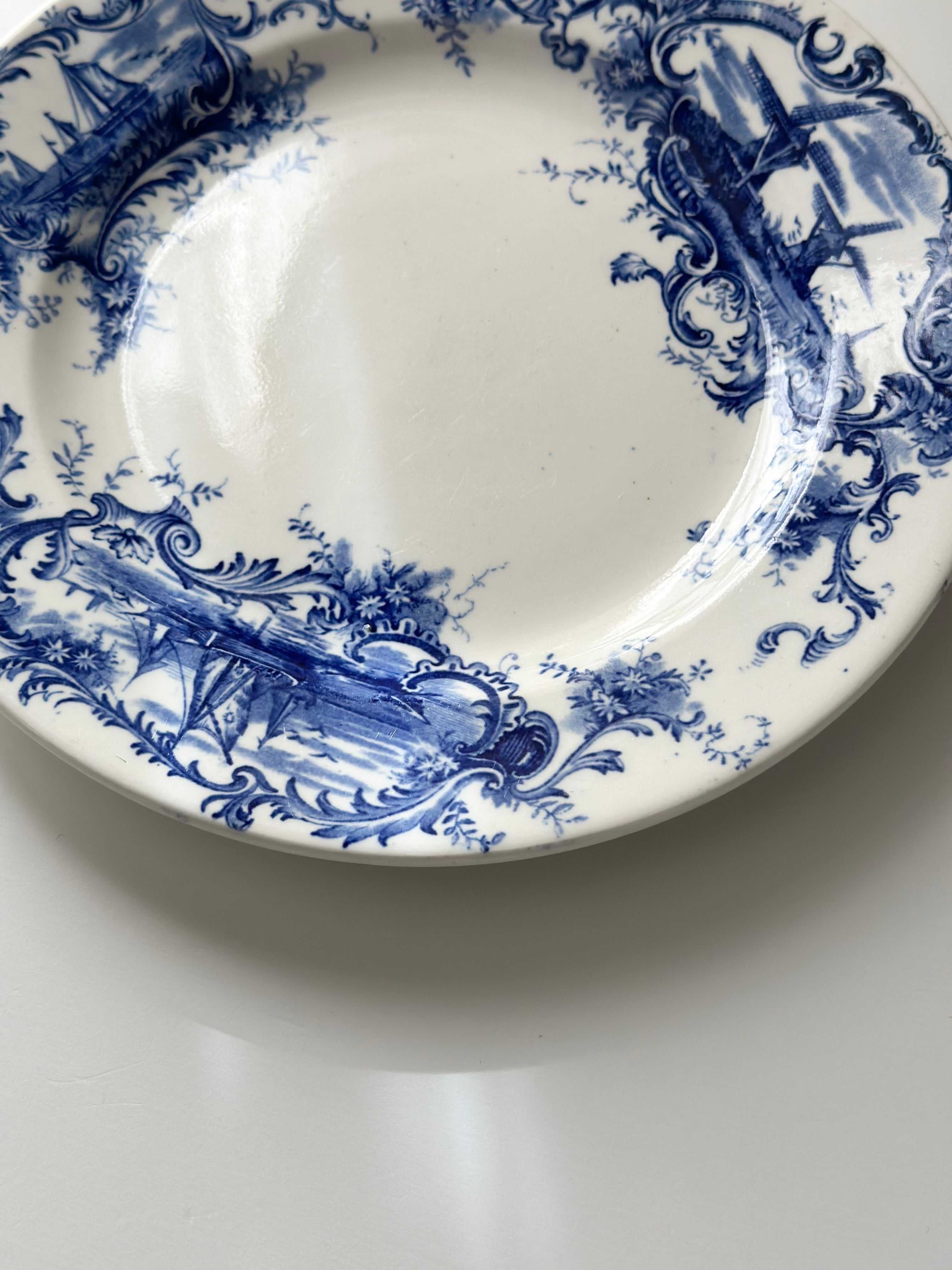 静かな海を行く帆船や、穏やかな田園風景が藍一色で描かれたプレートは、