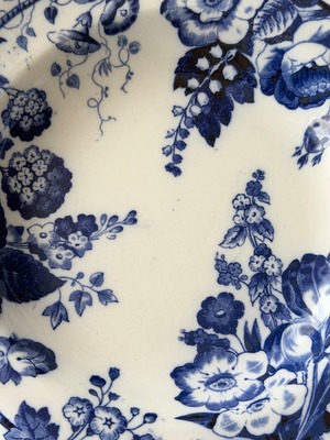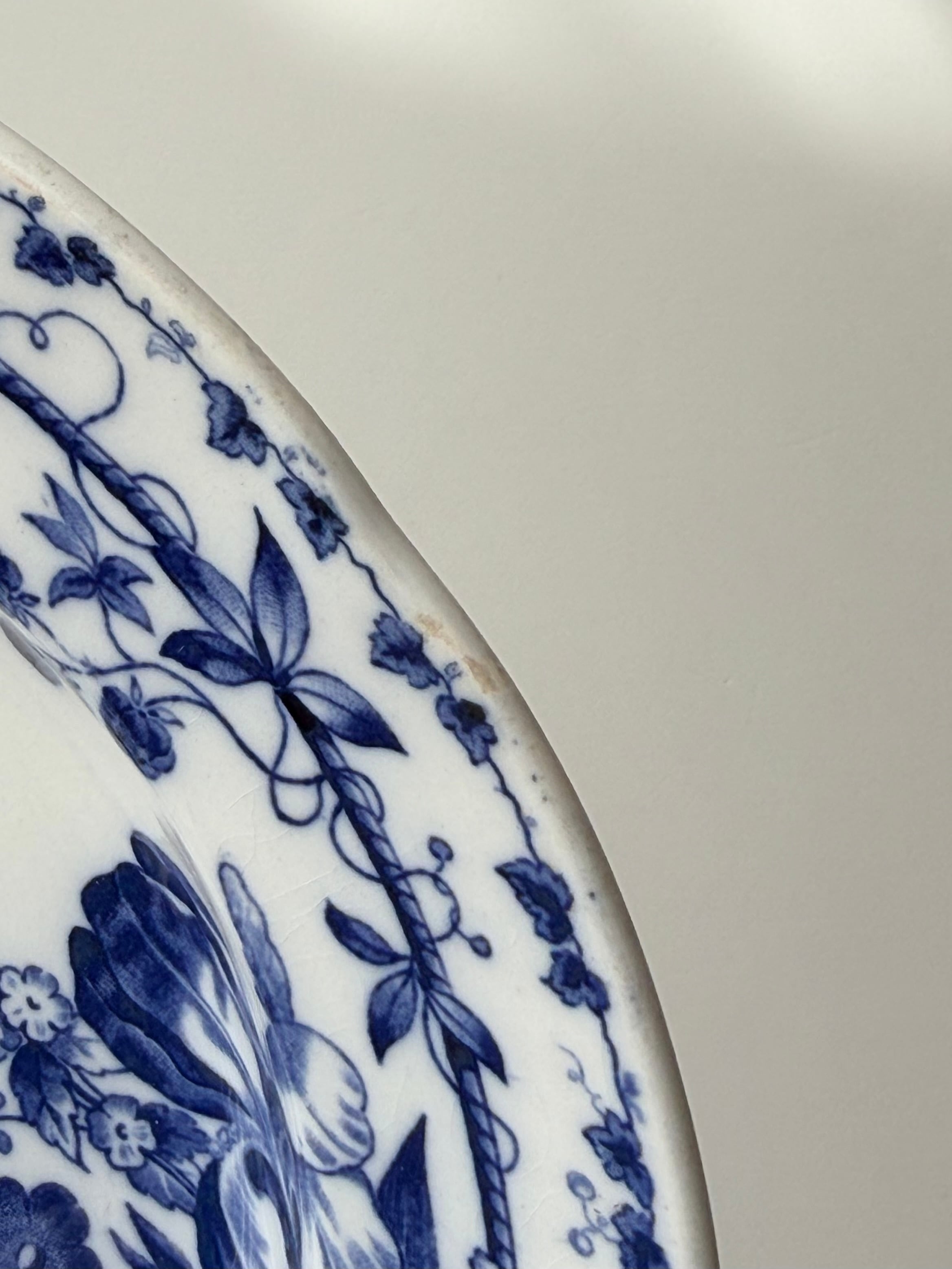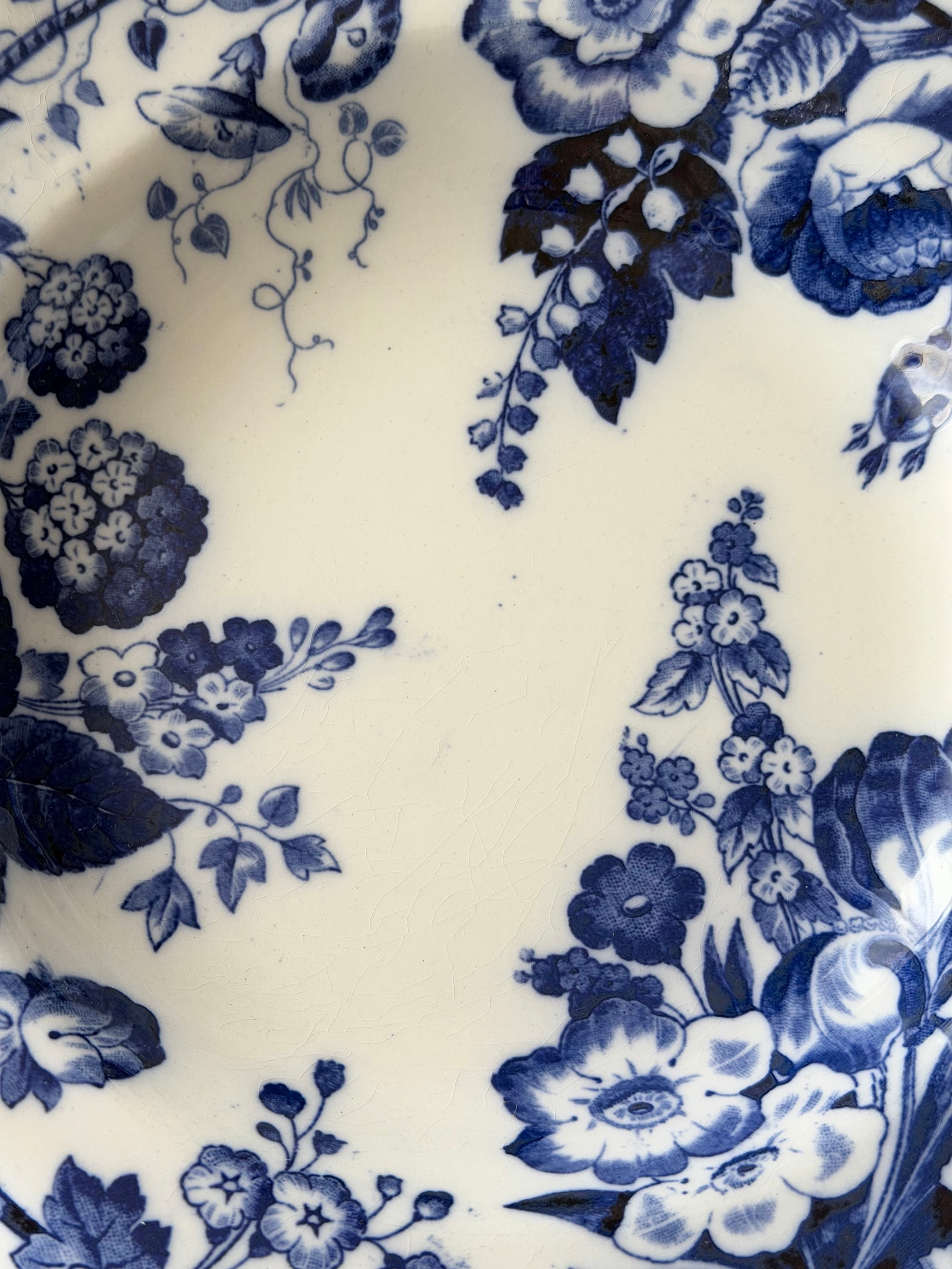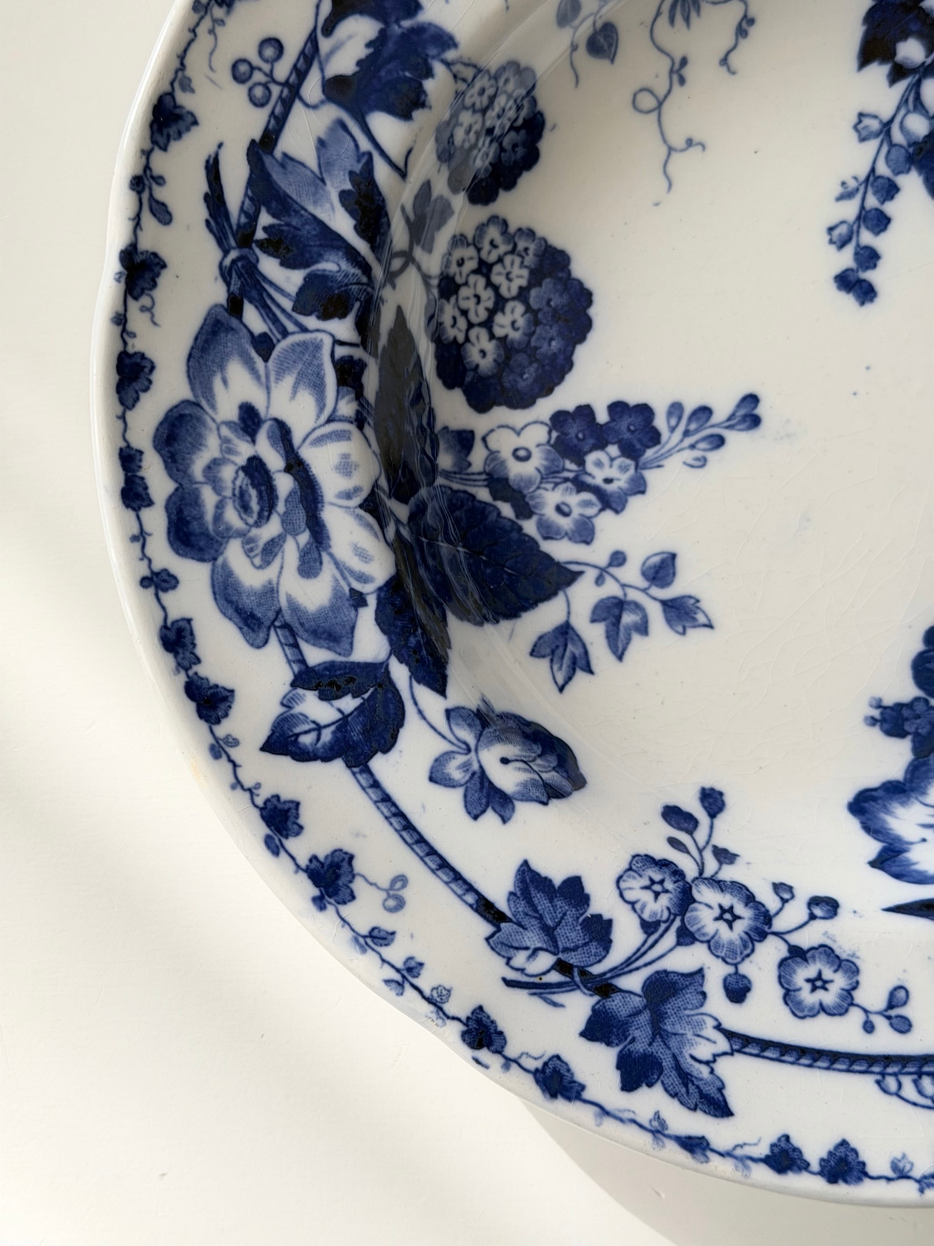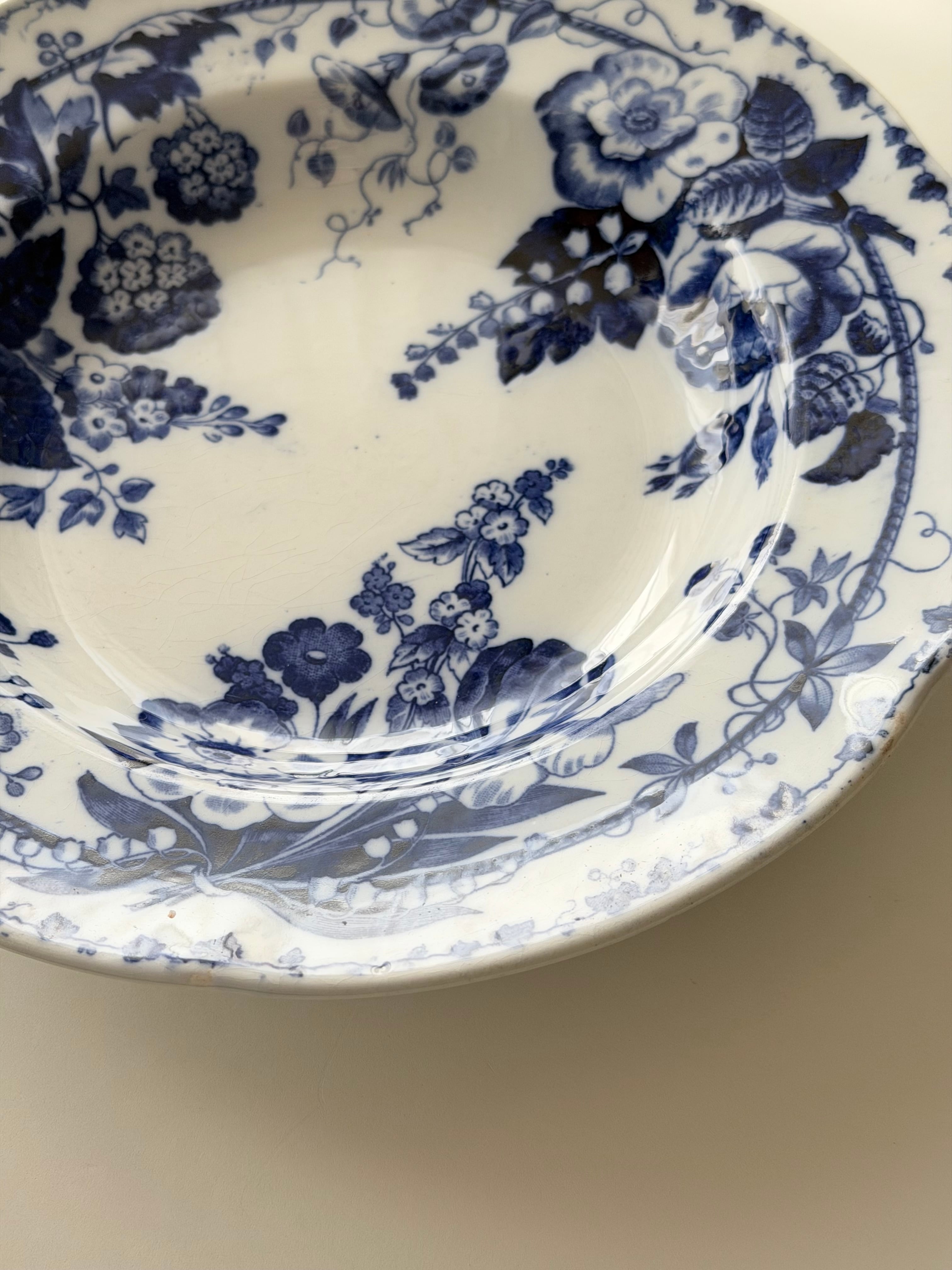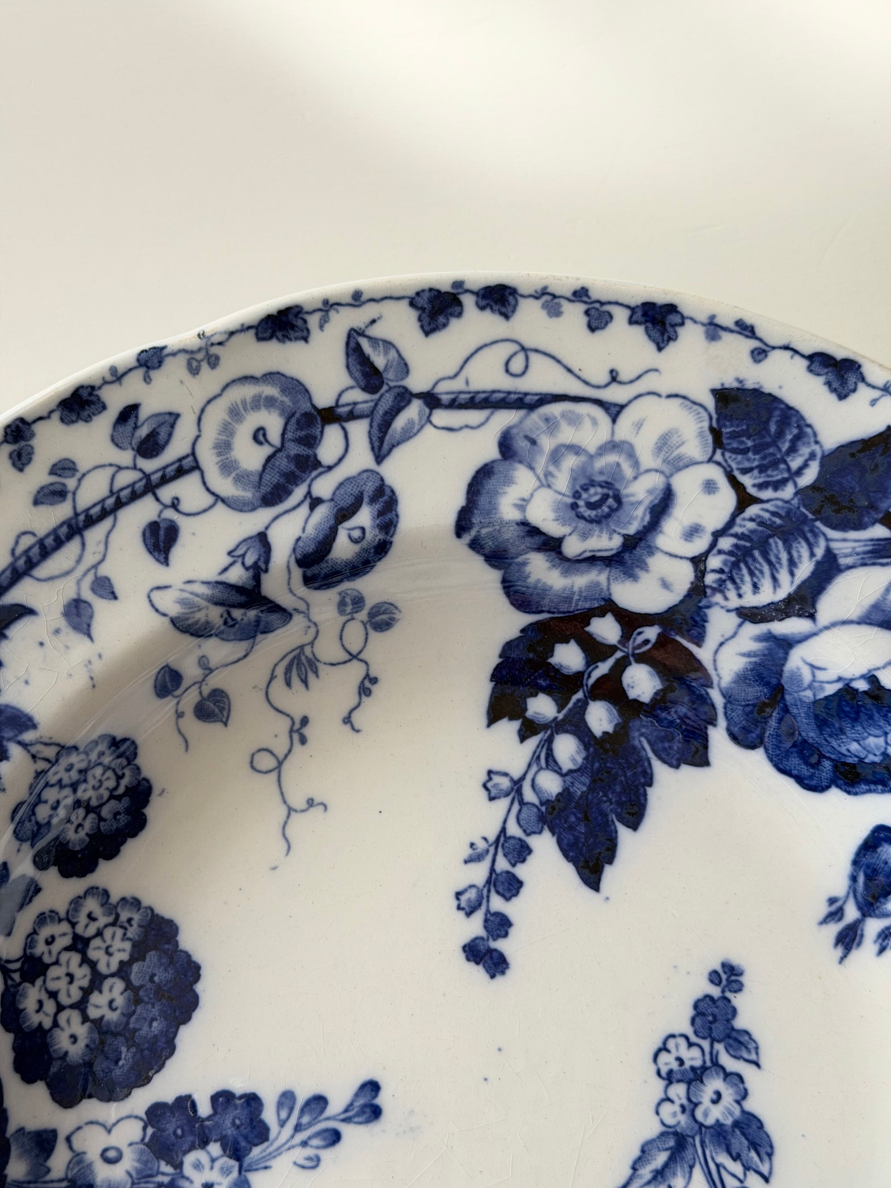 深いコバルトブルーで描かれた花々が、白地の余白に美しく映える1枚です。