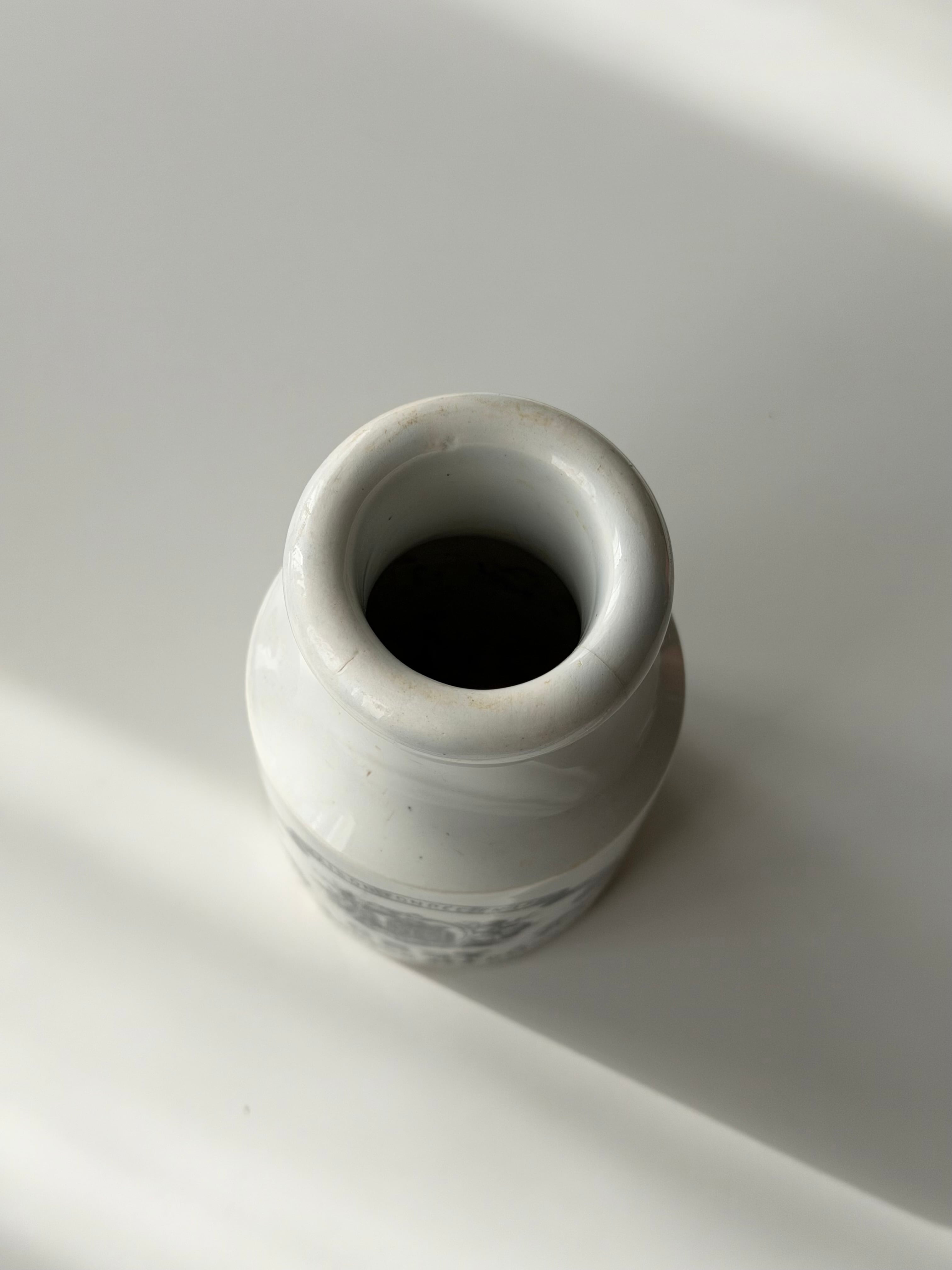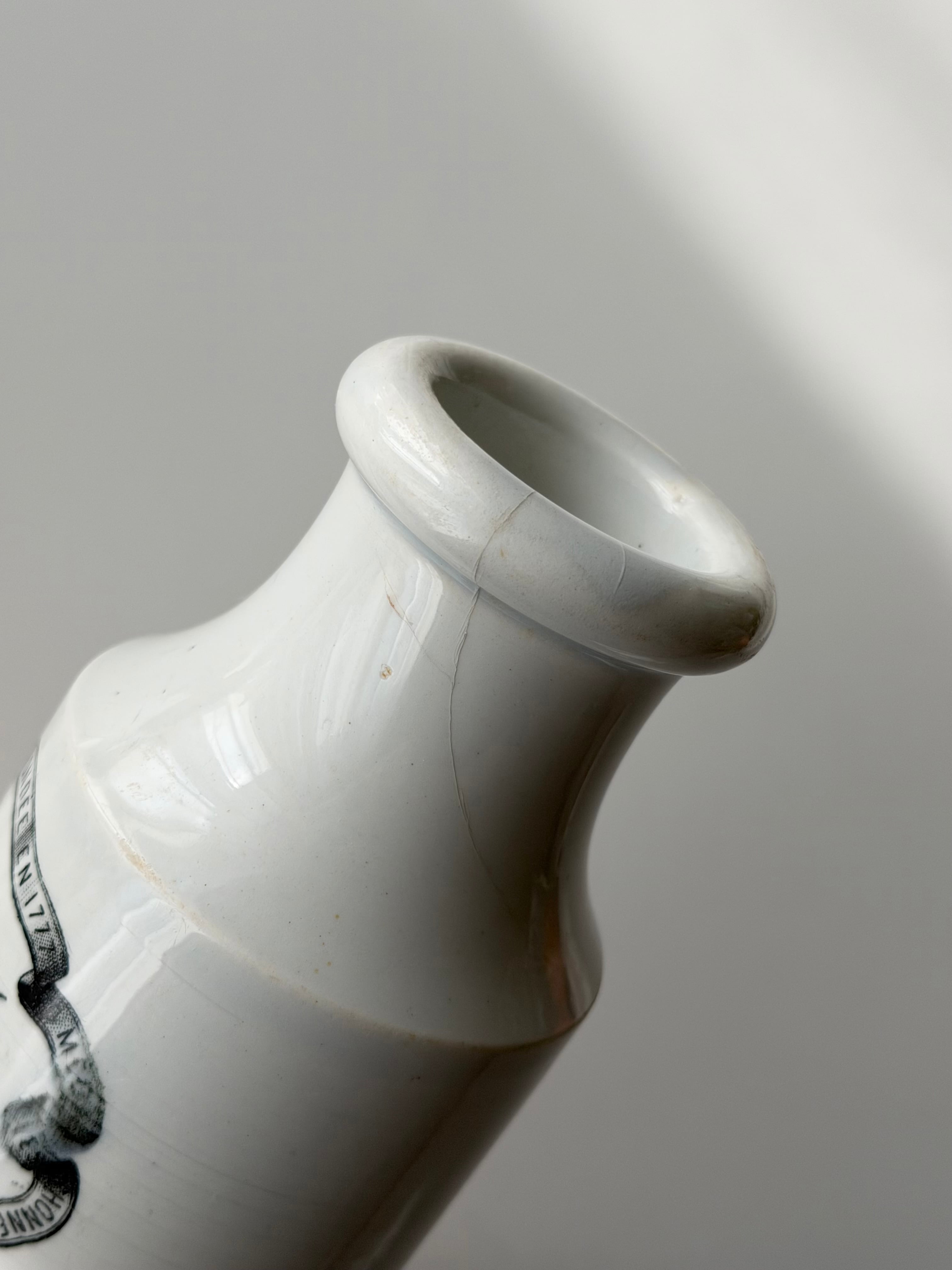 美しい白釉のボディに転写されたモノトーンのロゴやモチーフが