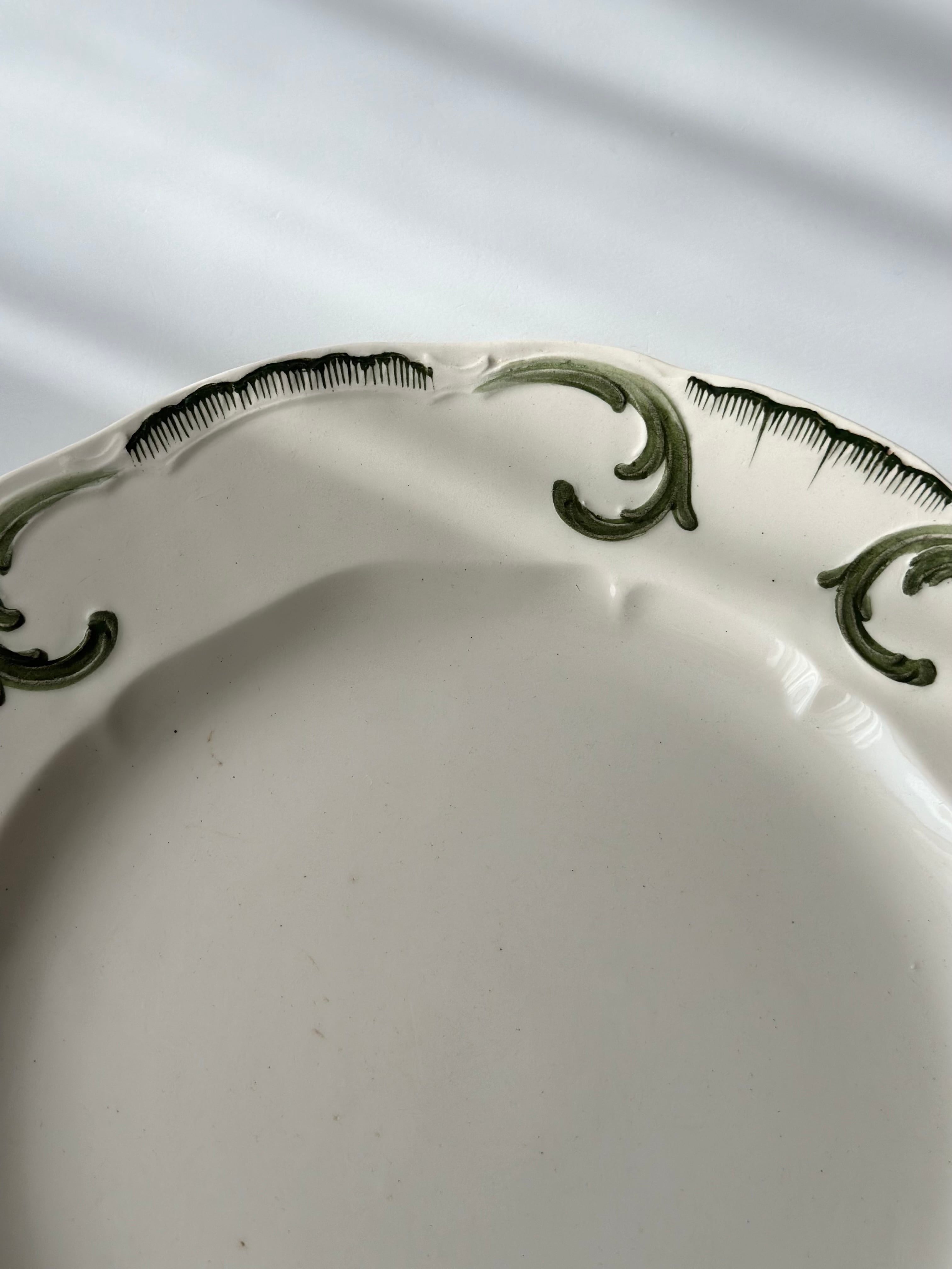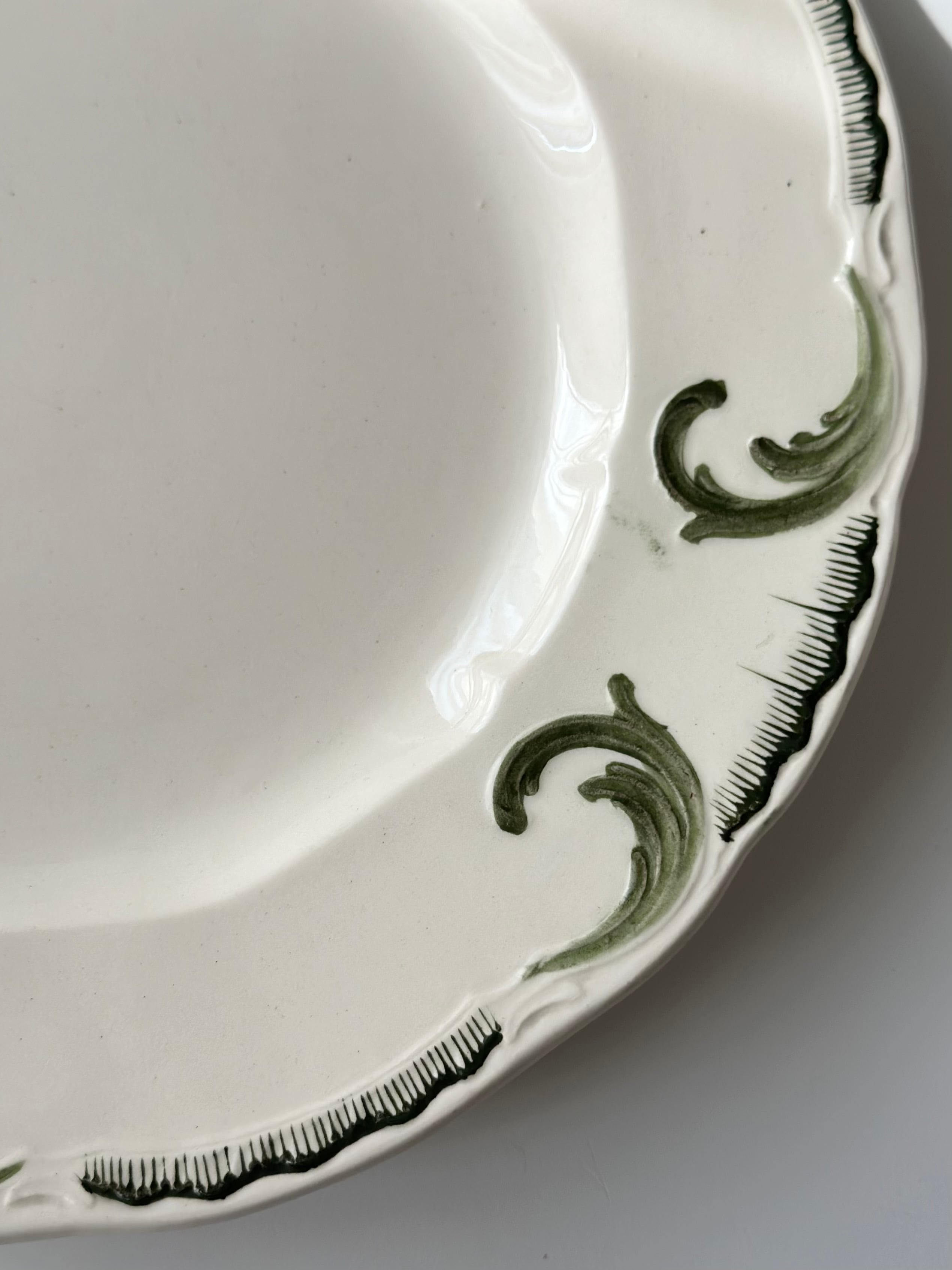 ゆるやかに波打つリムのフォルムに、深いグリーンで描かれた唐草のモチーフがほどよく映え、