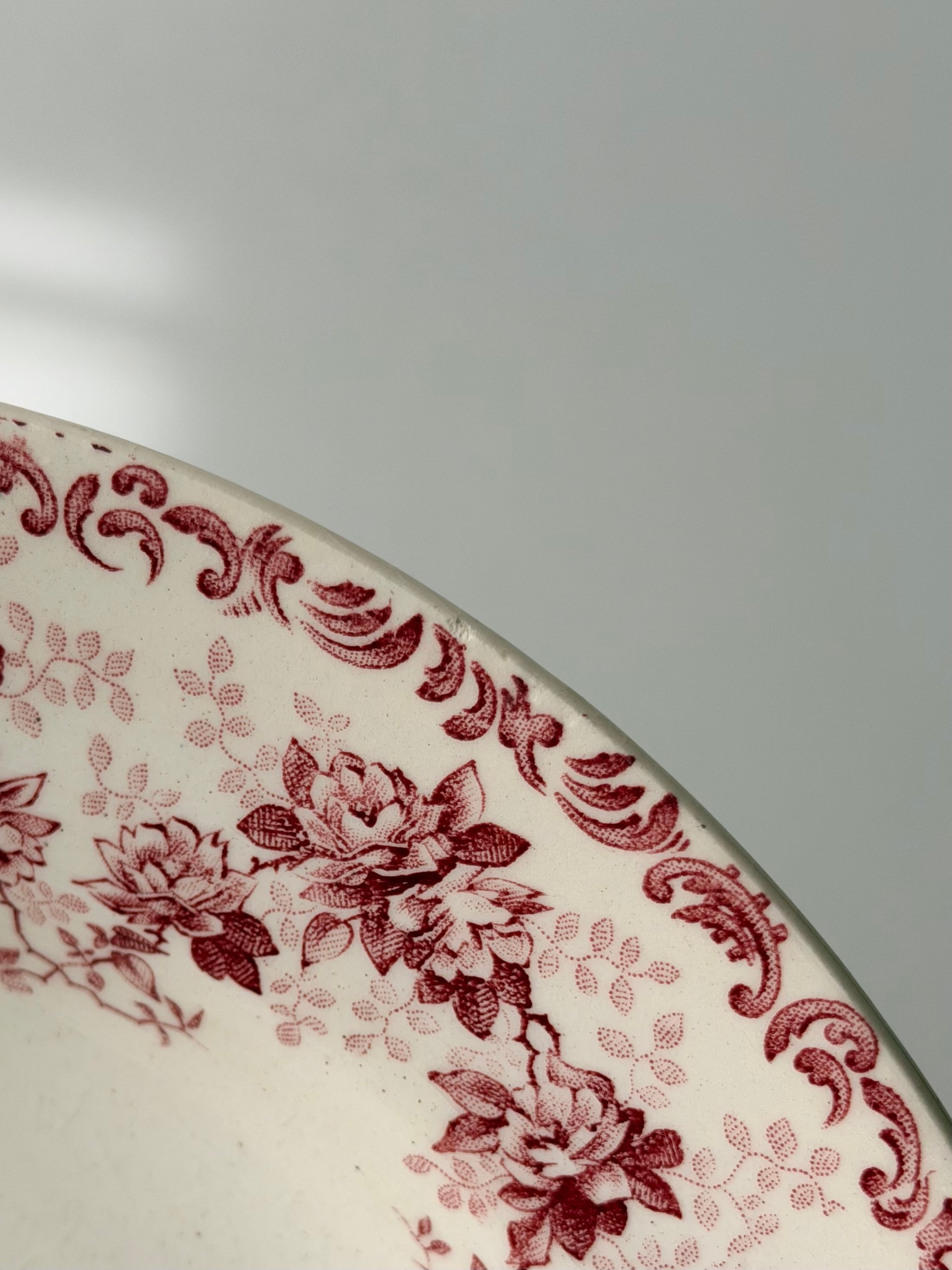 釉薬の上から転写された赤の絵柄は、光の具合でふわりと濃淡が浮かび、
