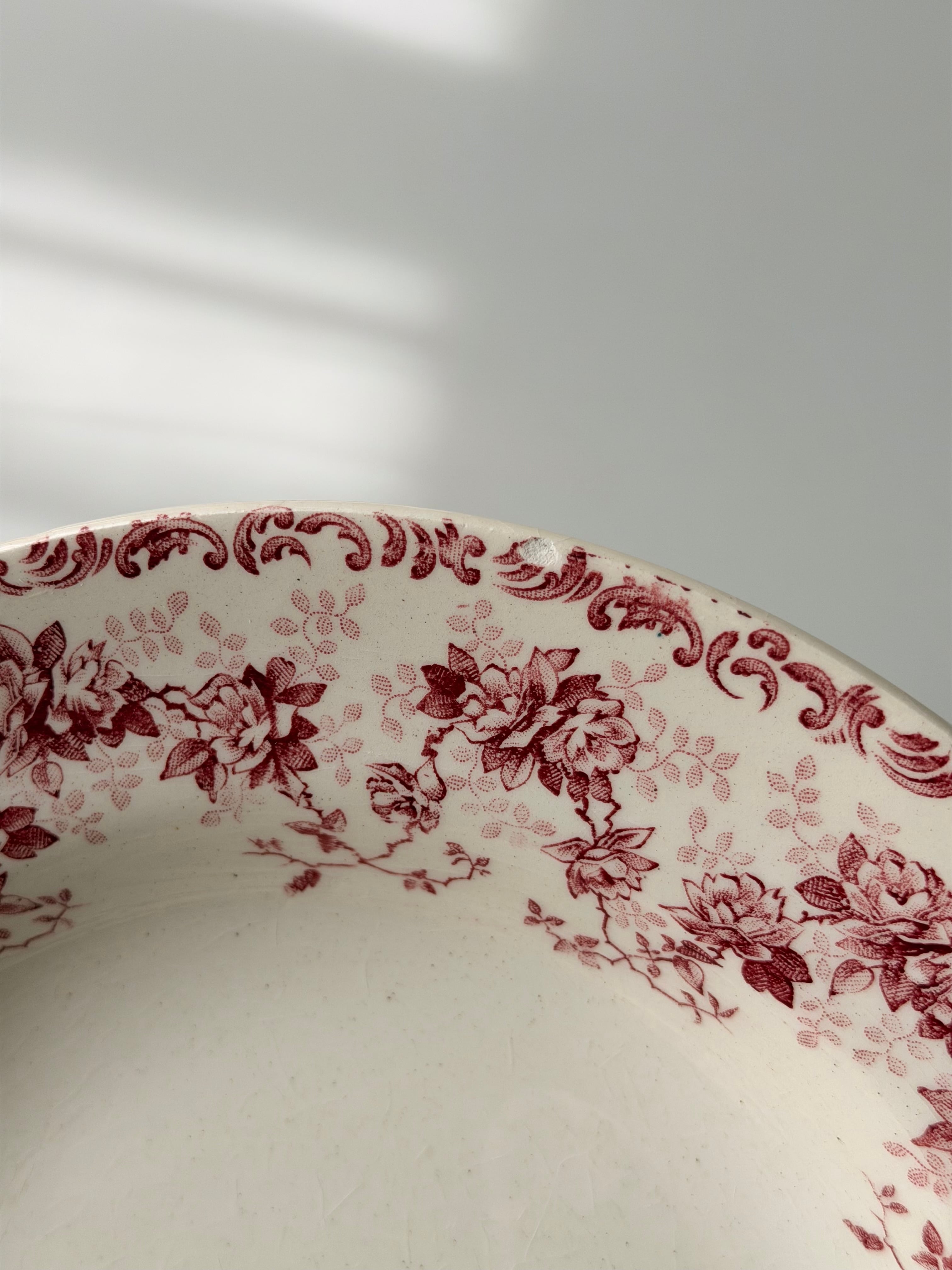 赤みがかったボルドー色で、リムのまわりいっぱいに小花が連なった、