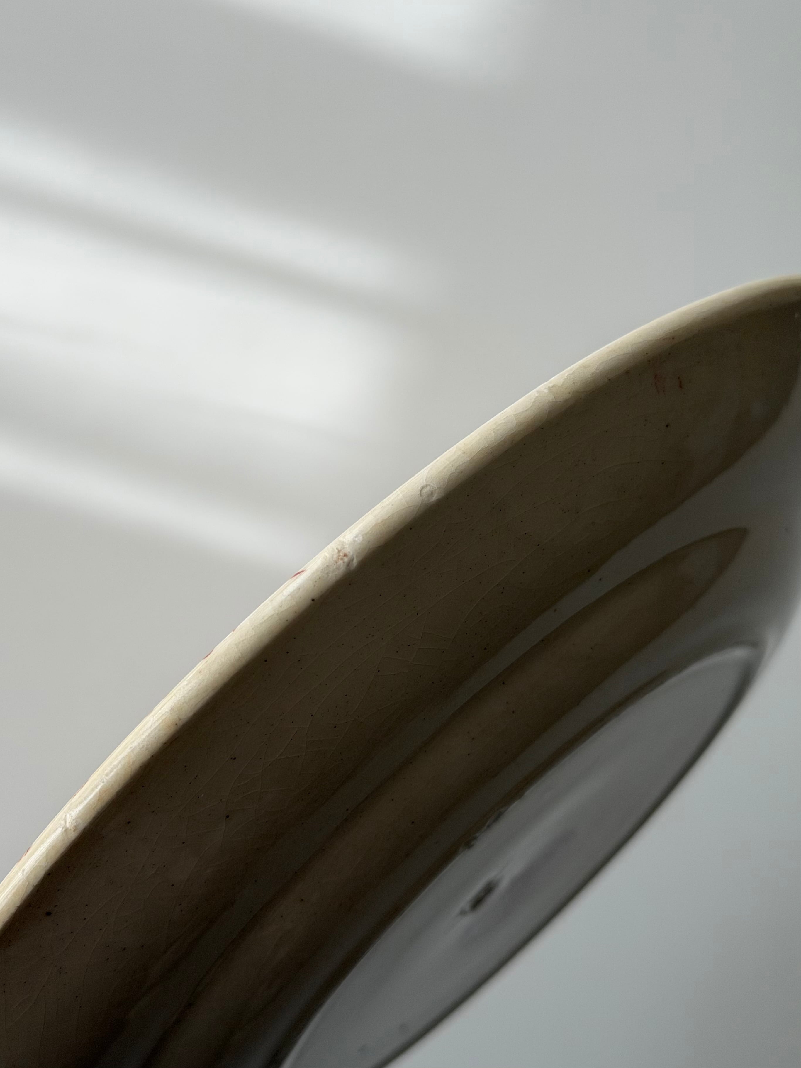釉薬の上から転写された赤の絵柄は、光の具合でふわりと濃淡が浮かび、