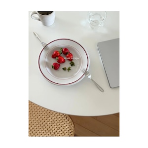 やわらかな白磁のリムに入った赤いラインが印象的で、