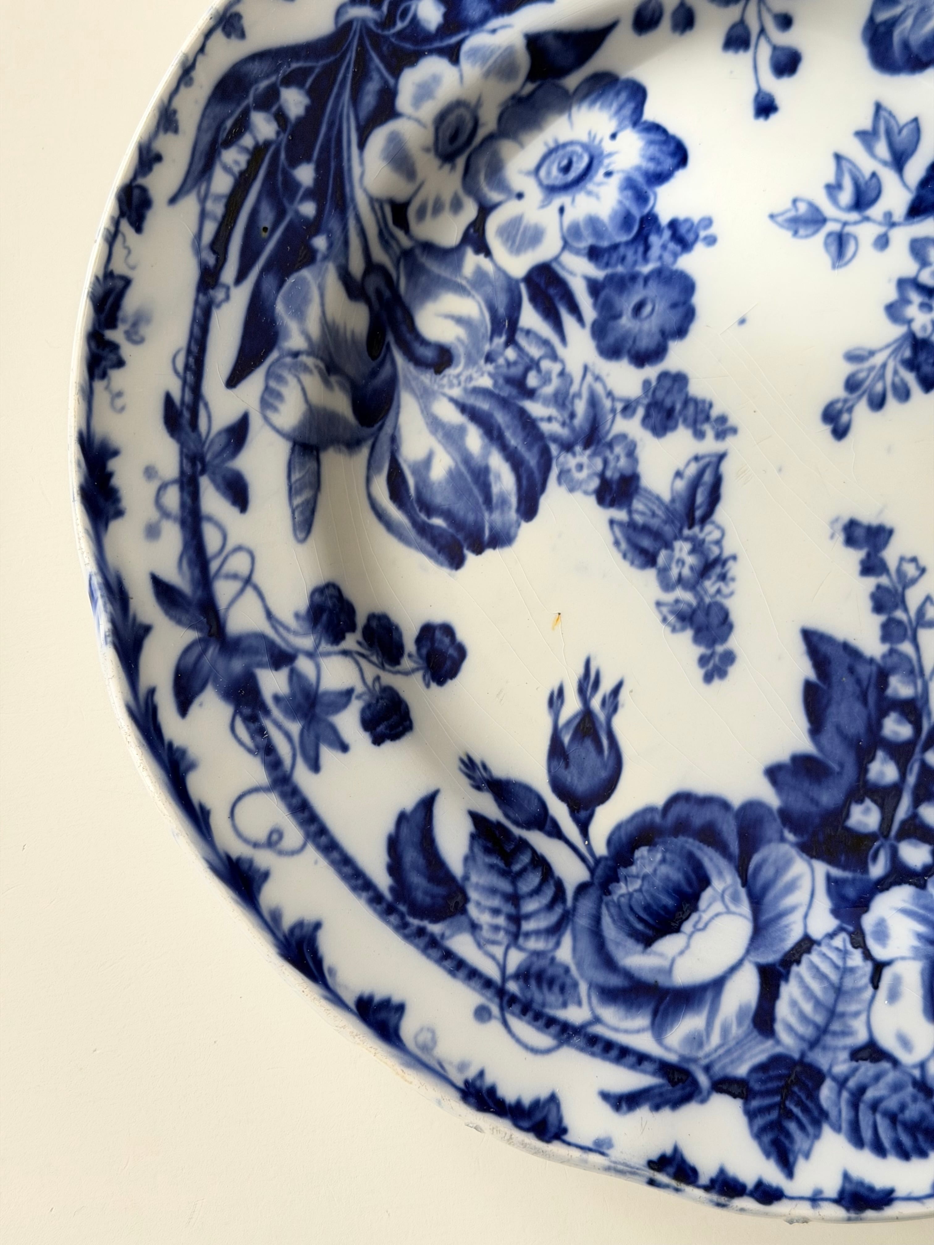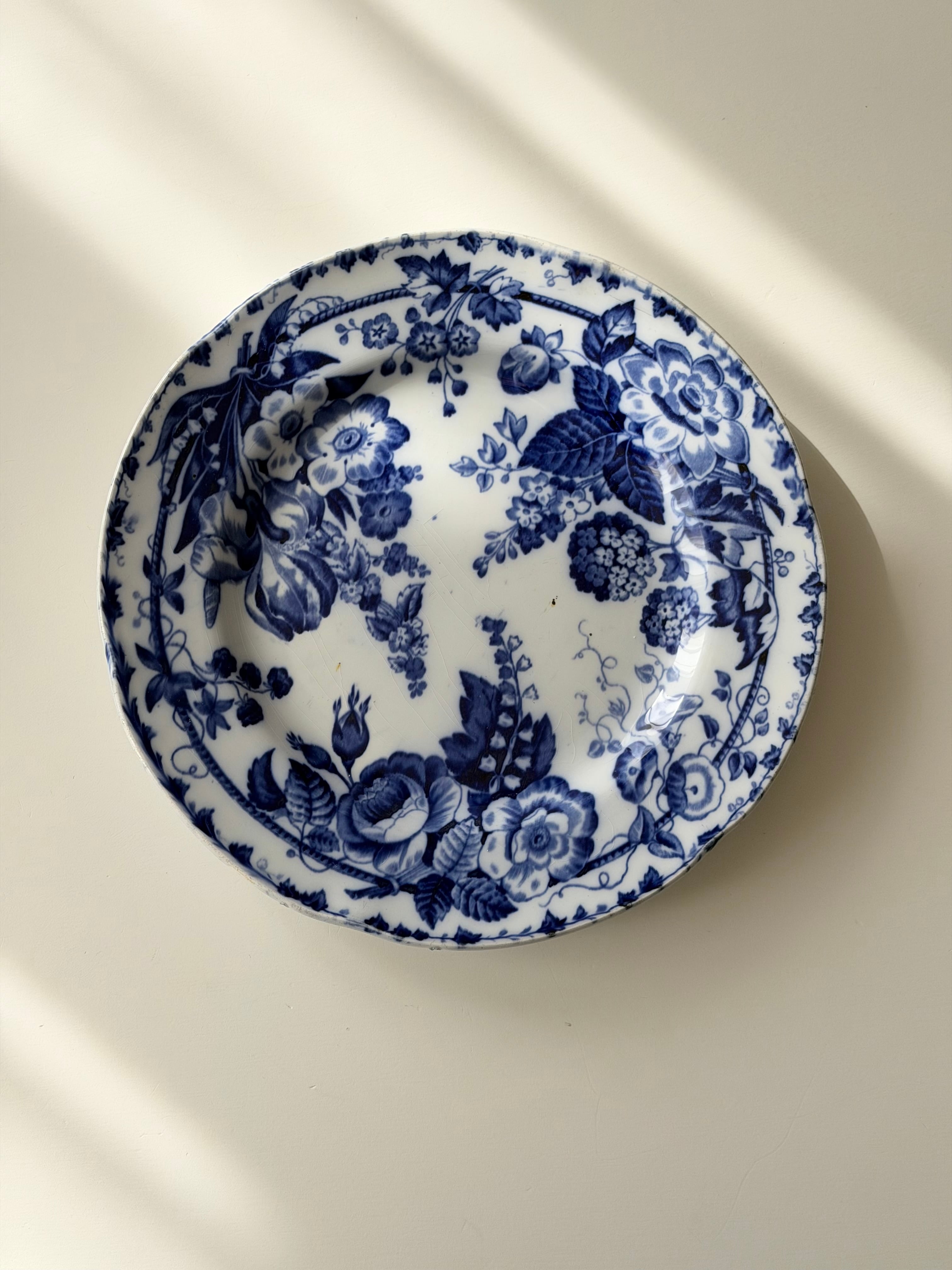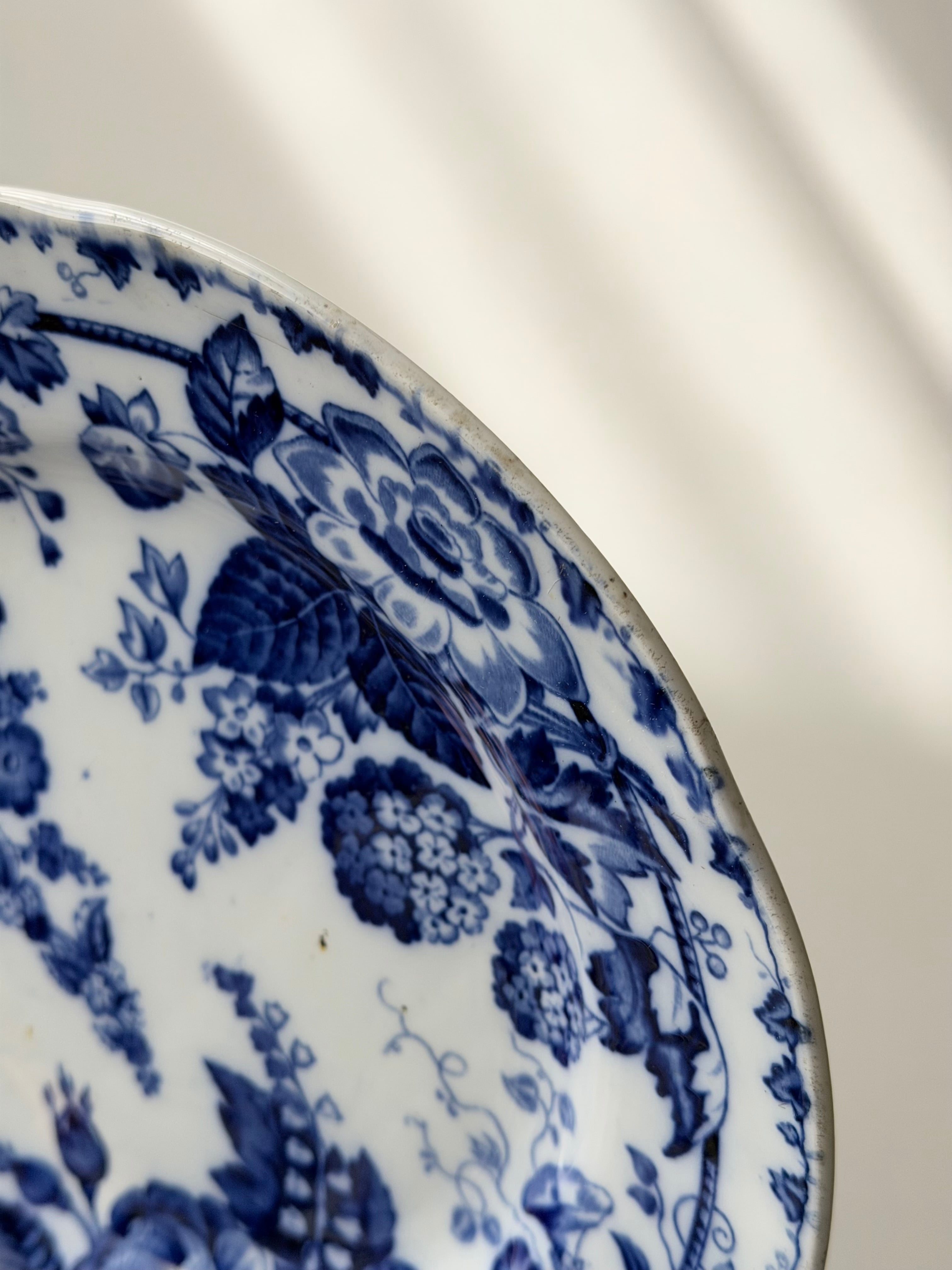 深いコバルトブルーで描かれた花々が、白地の余白に美しく映える1枚です。