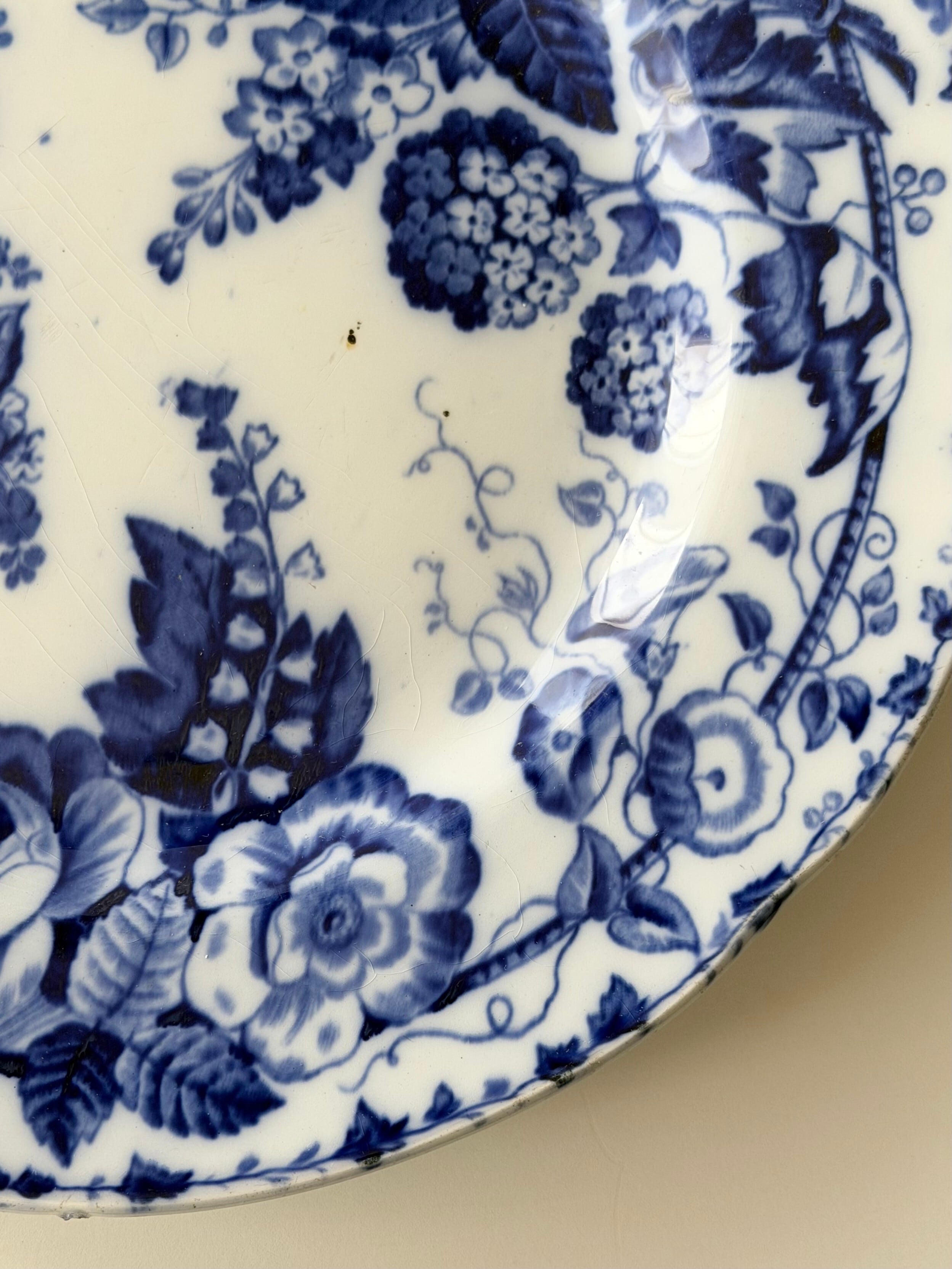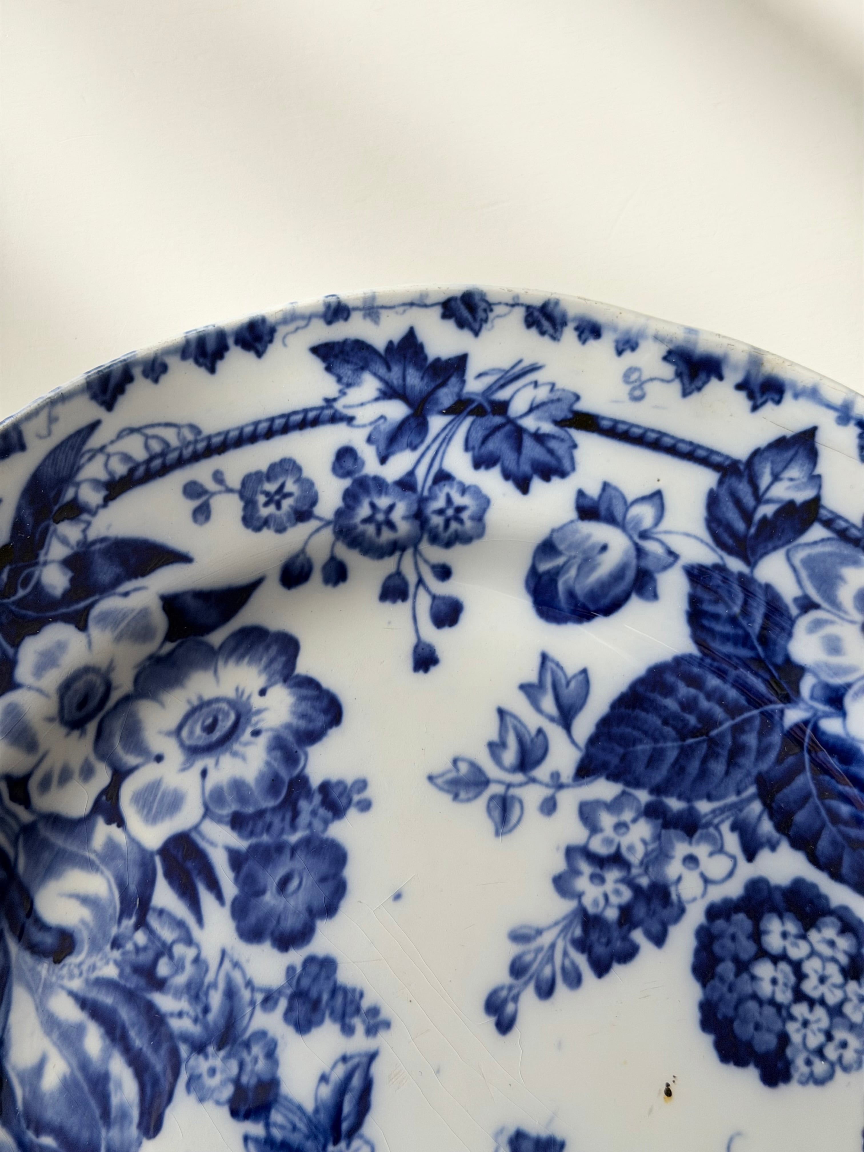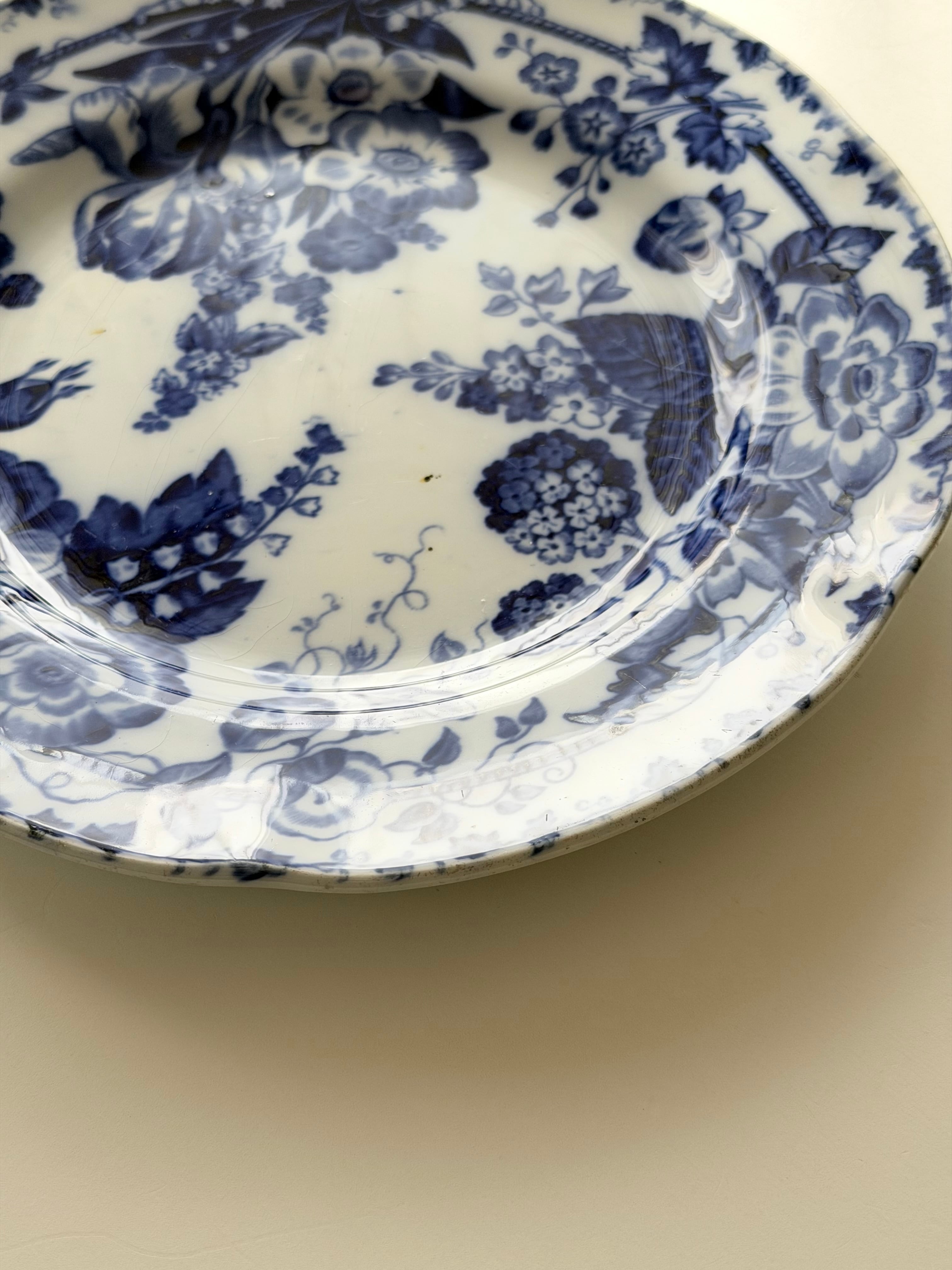 深いコバルトブルーで描かれた花々が、白地の余白に美しく映える1枚です。