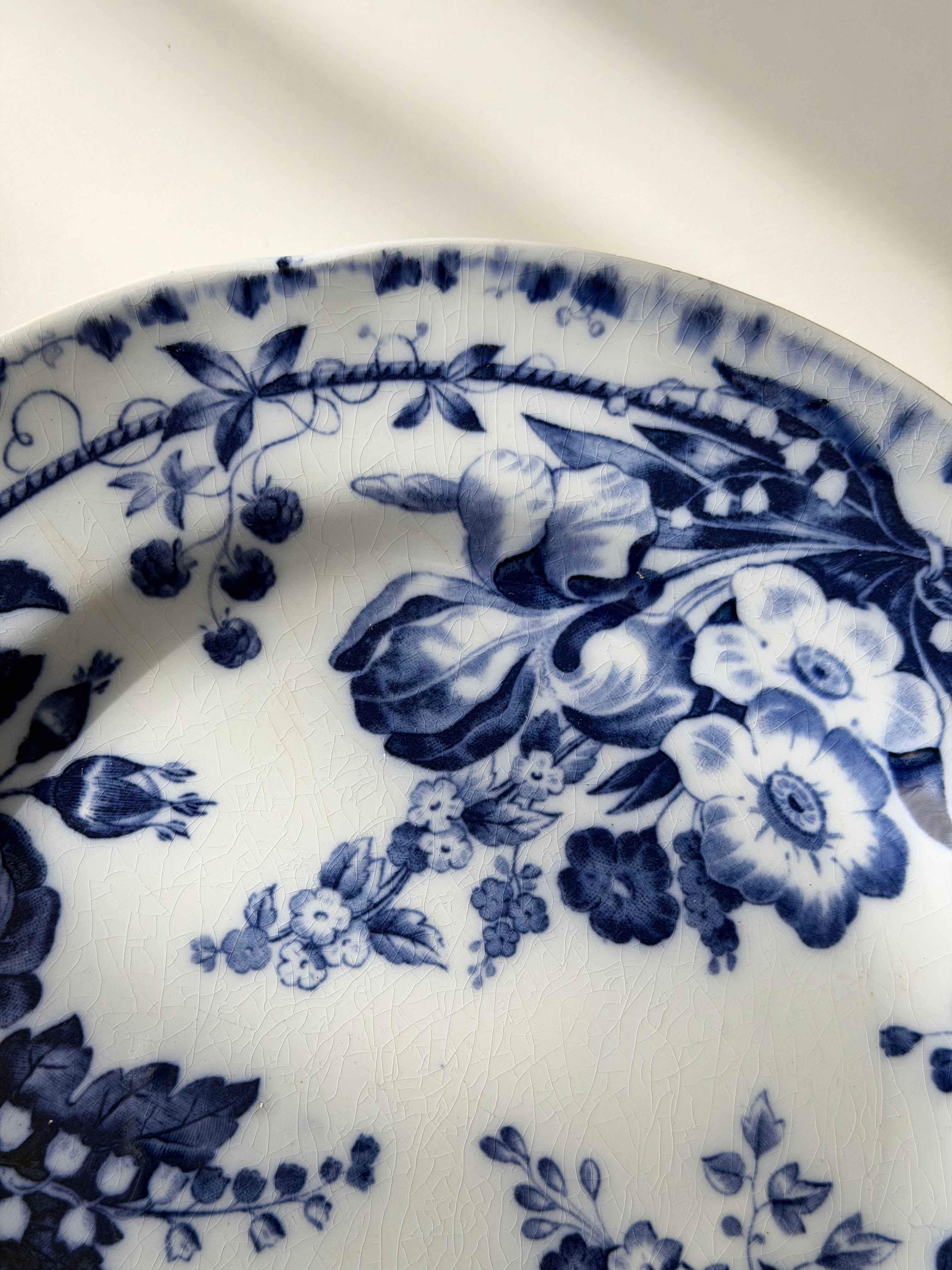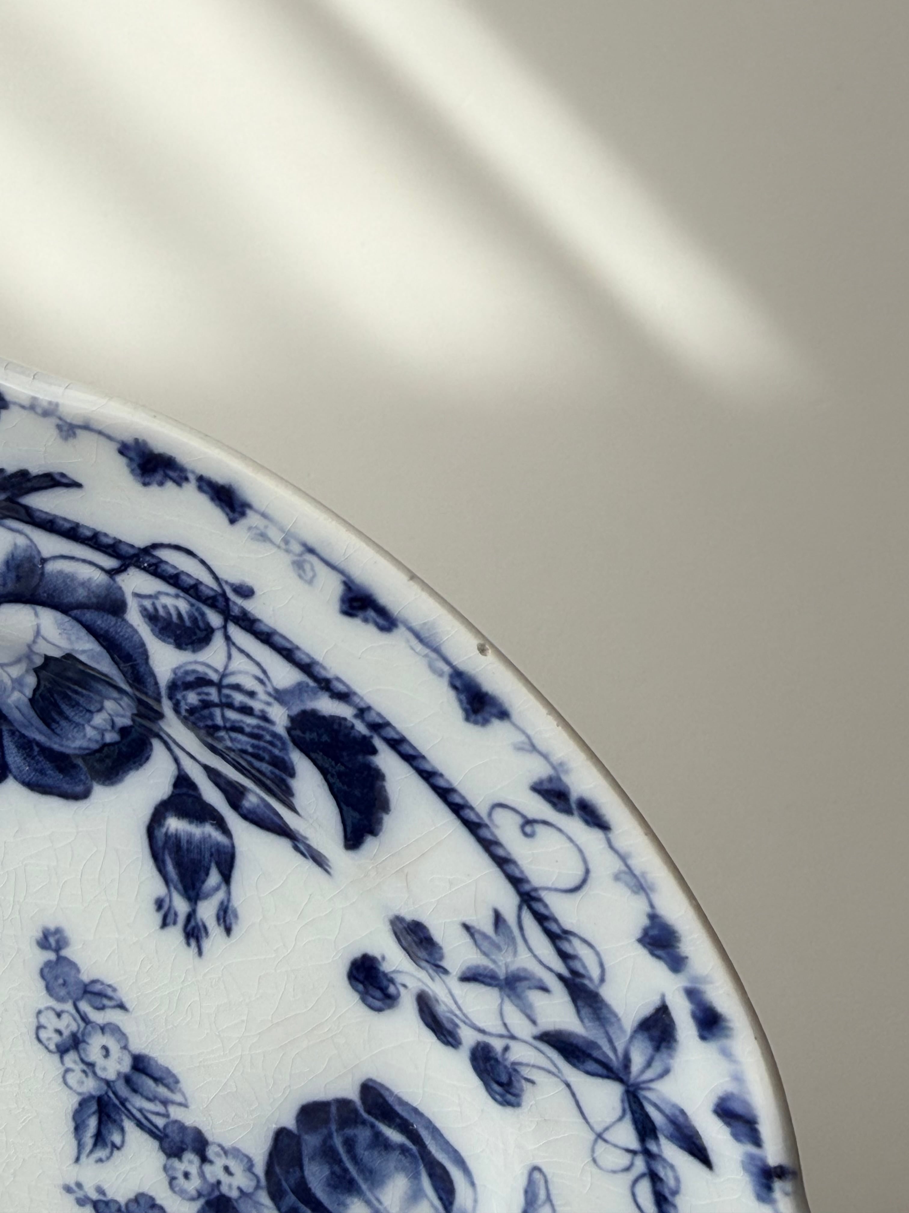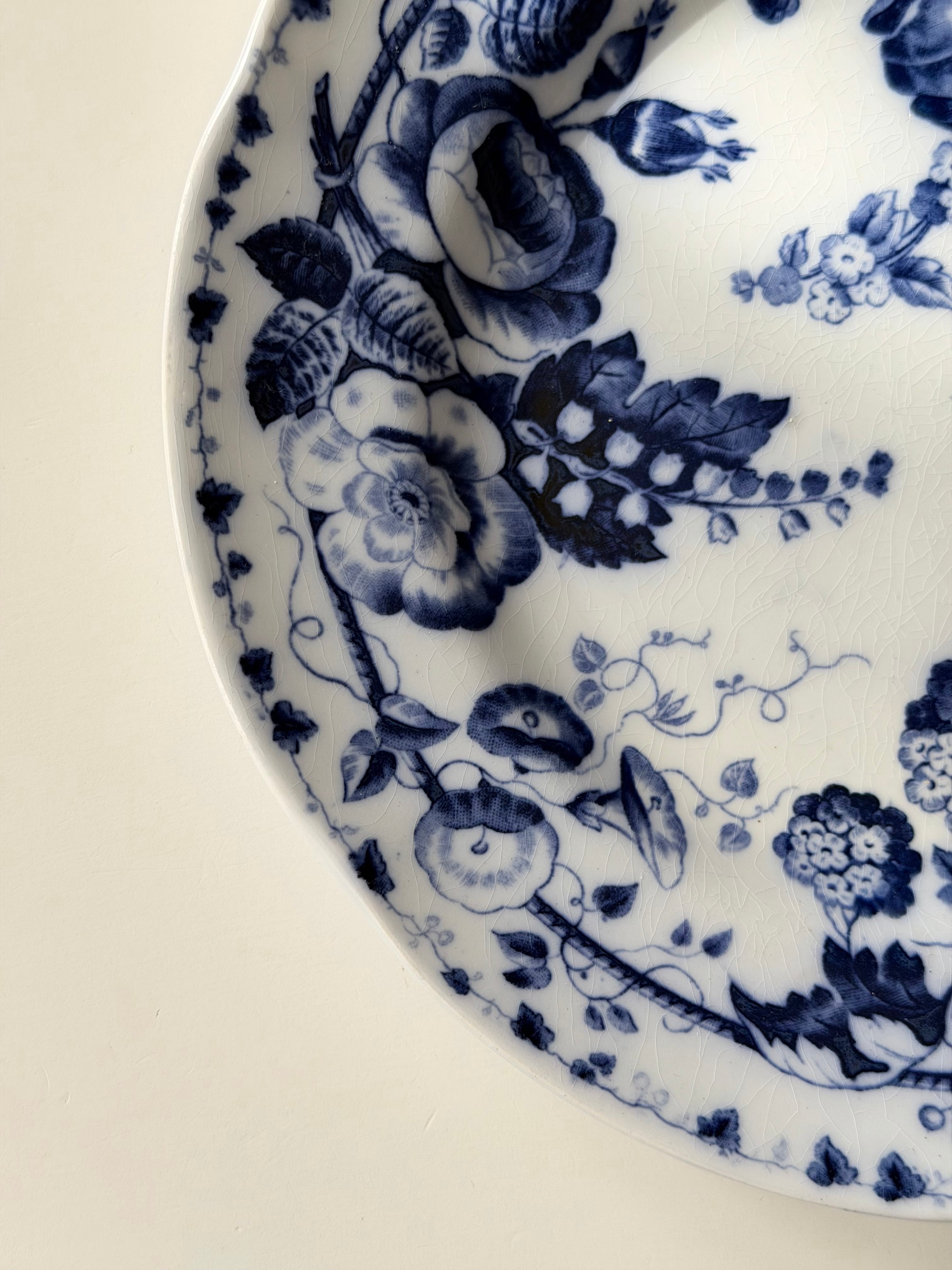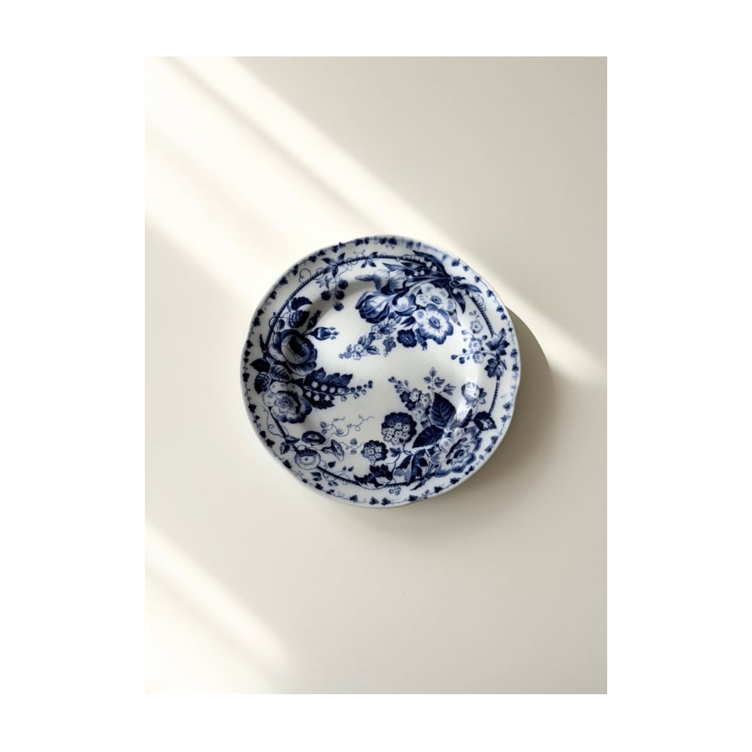 深いコバルトブルーで描かれた花々が、白地の余白に美しく映える1枚です。