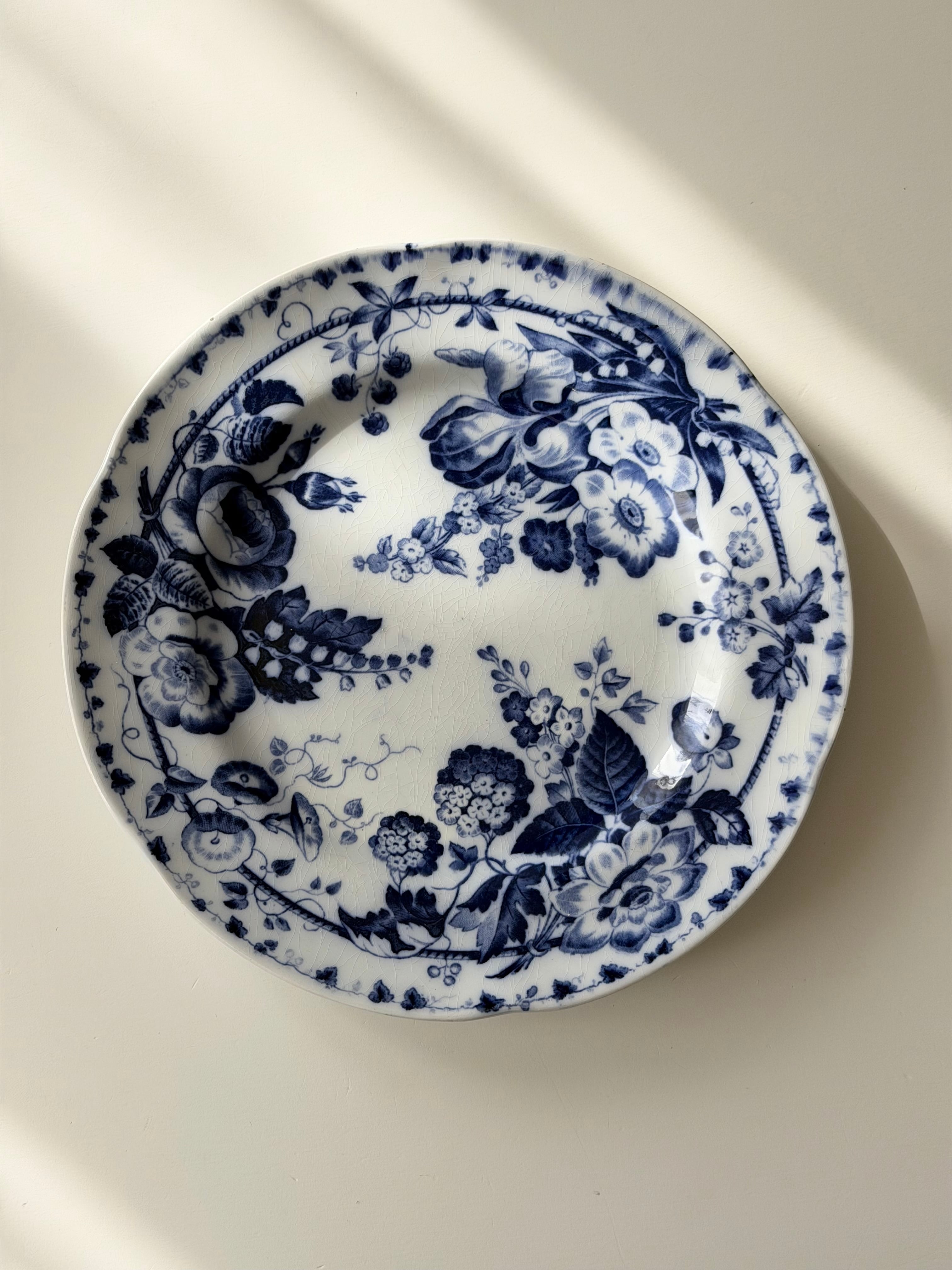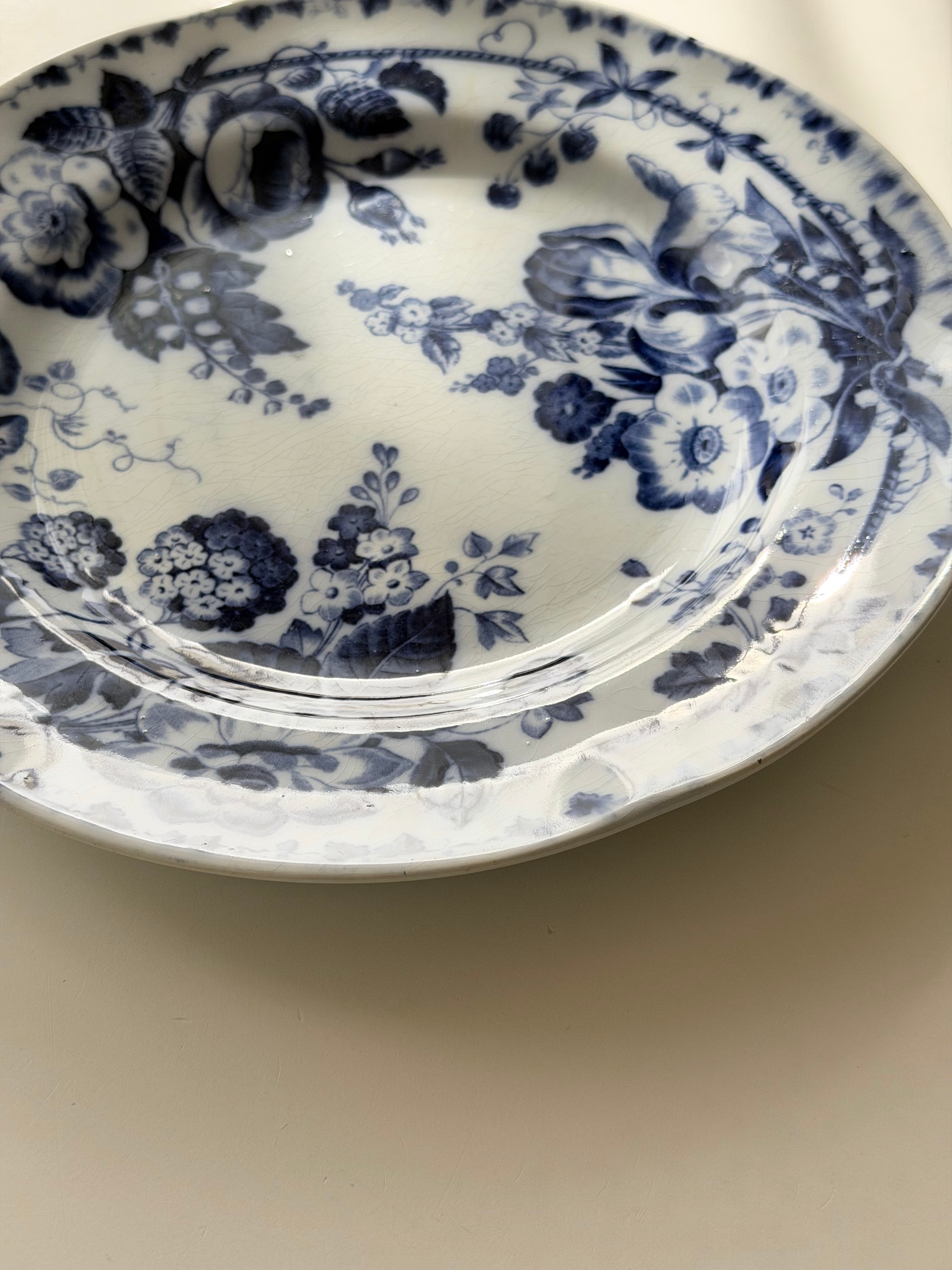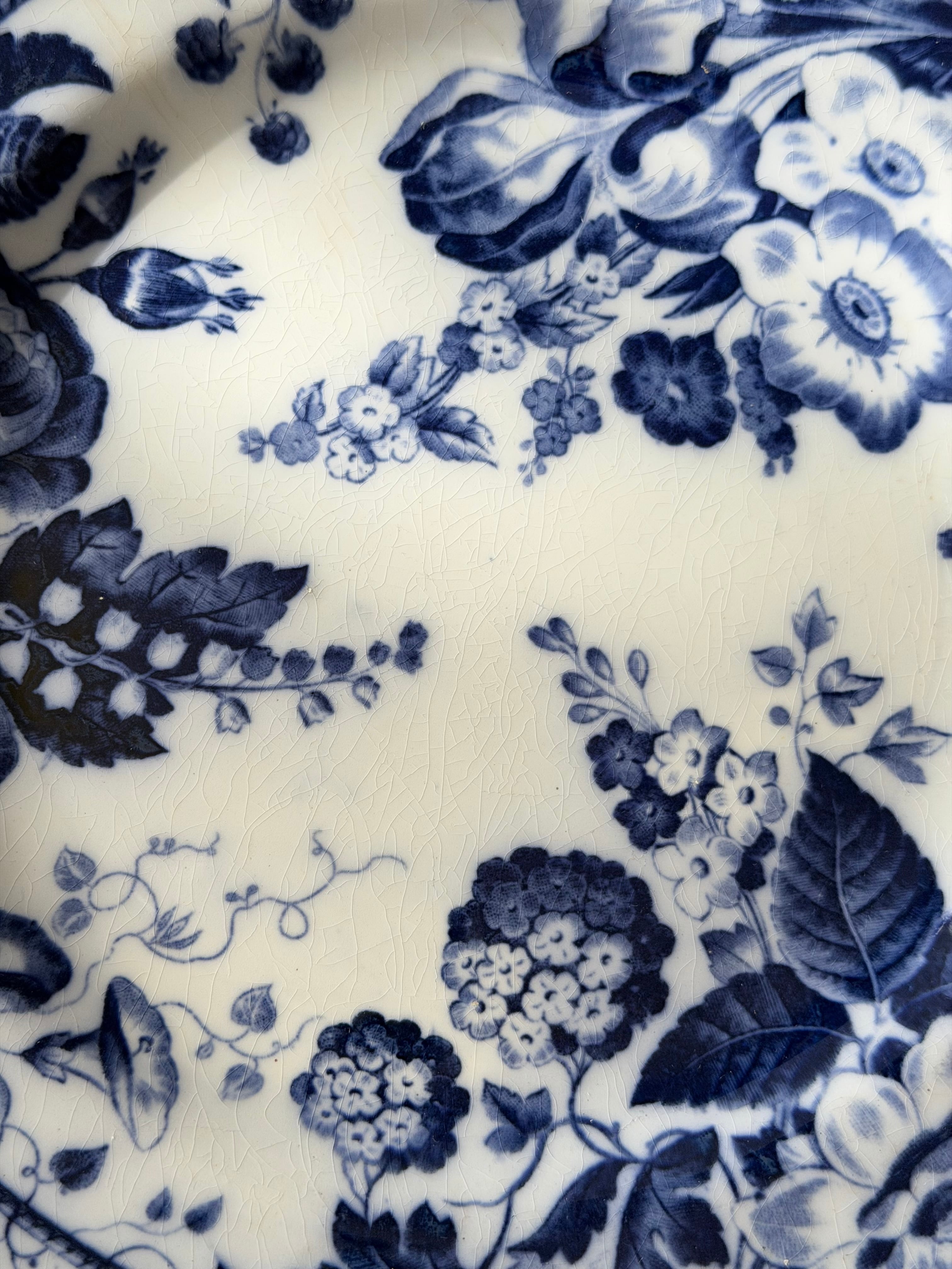深いコバルトブルーで描かれた花々が、白地の余白に美しく映える1枚です。