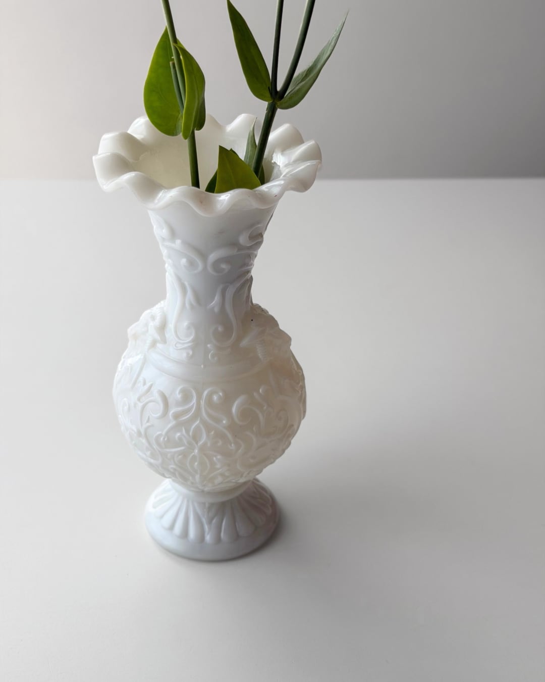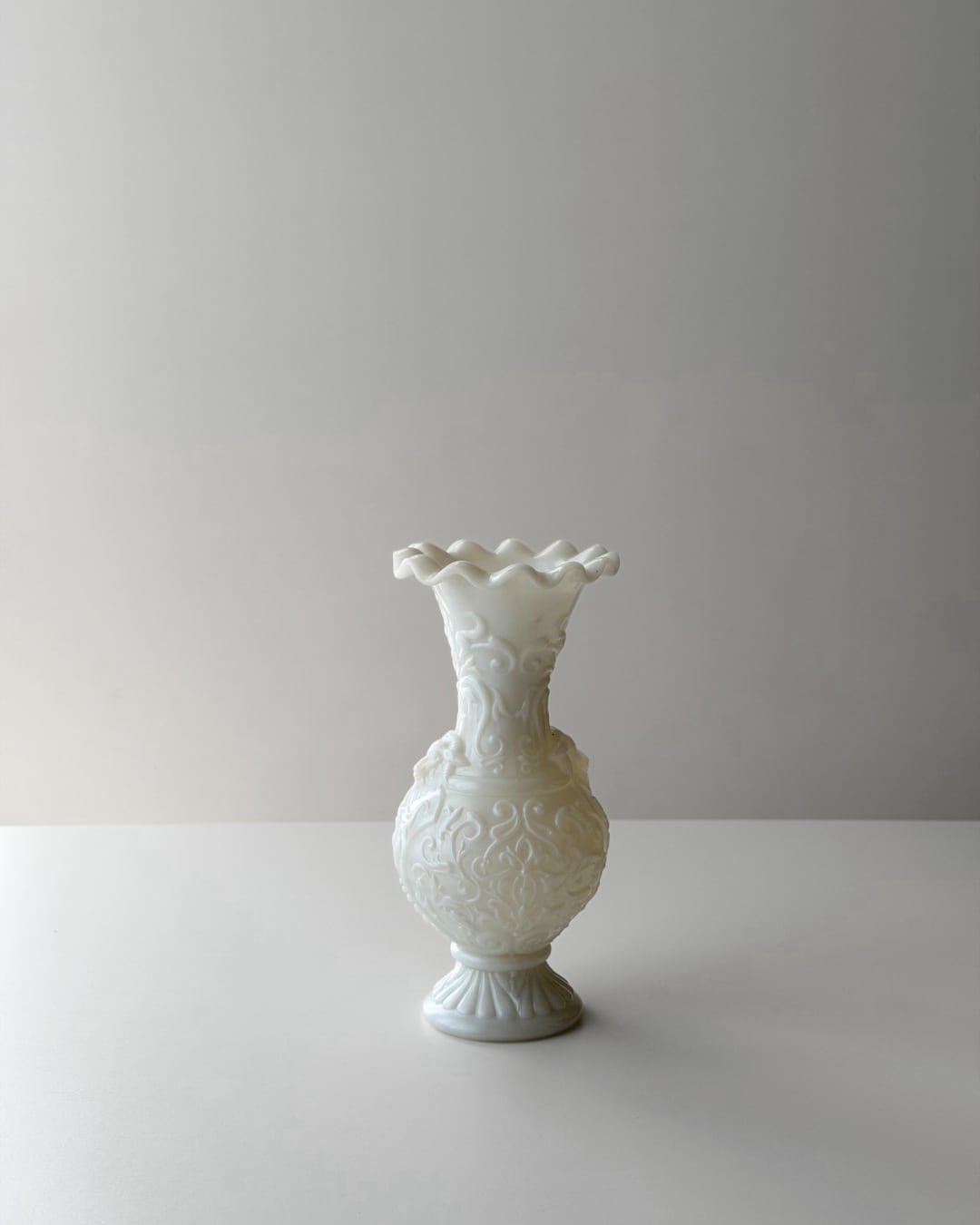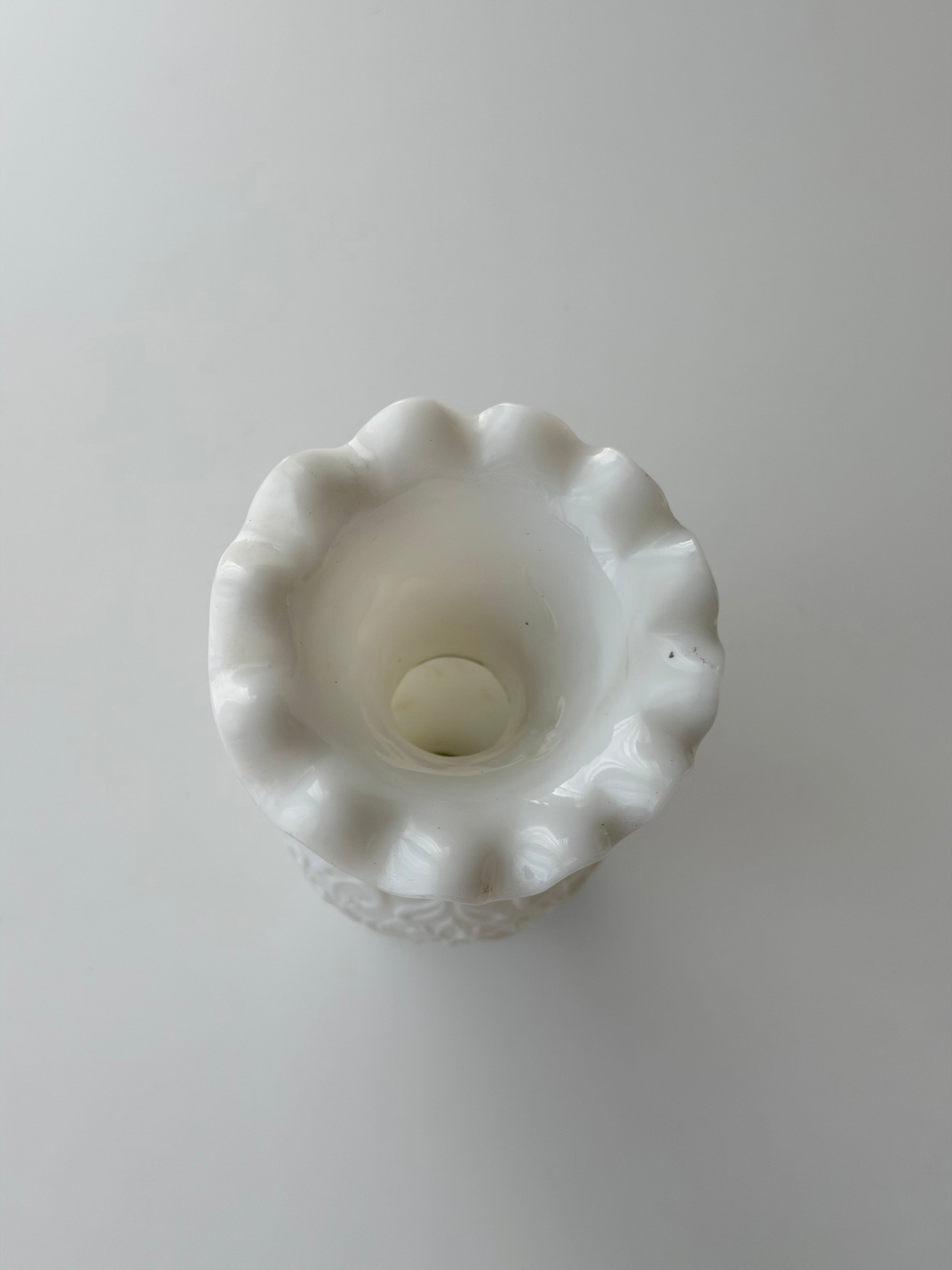フランスにて買い付けた、Portieuxによるオパリンガラスのフラワーベースです。
