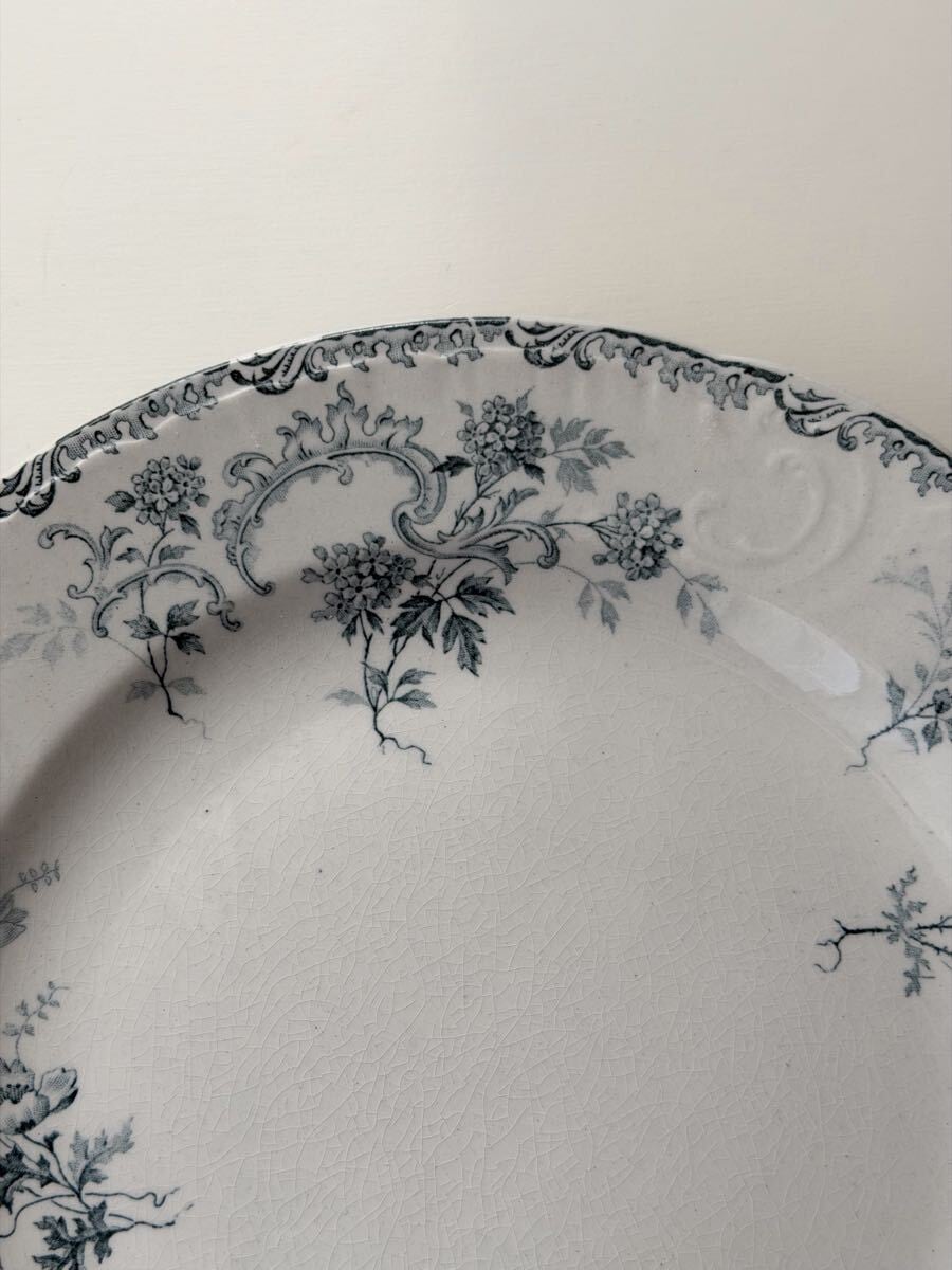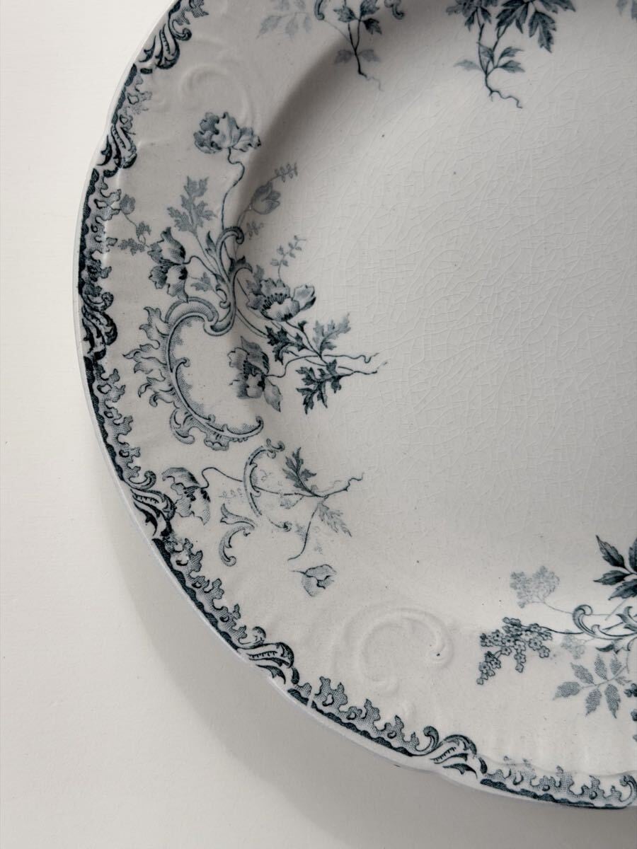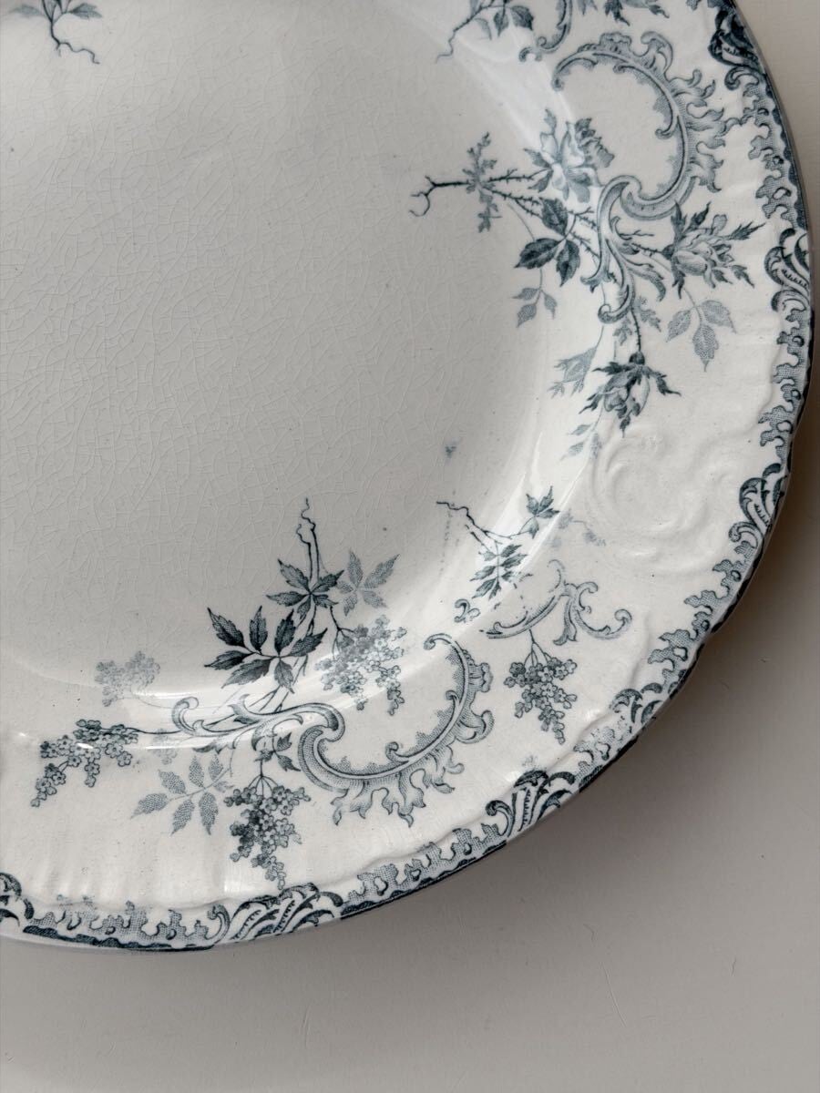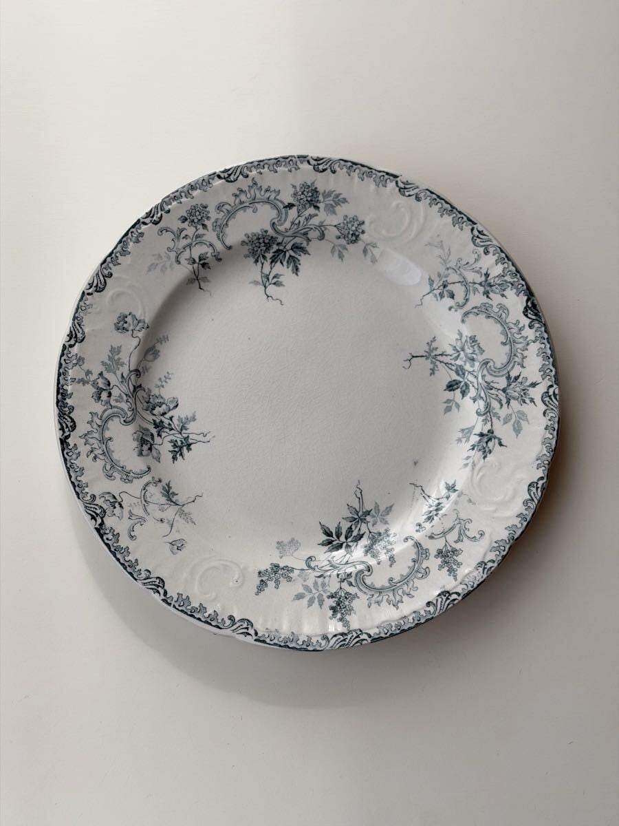 白釉に繊細なブルーグレーの植物文様が広がり、リムにはエンボス装飾が施された上品な1枚です。
