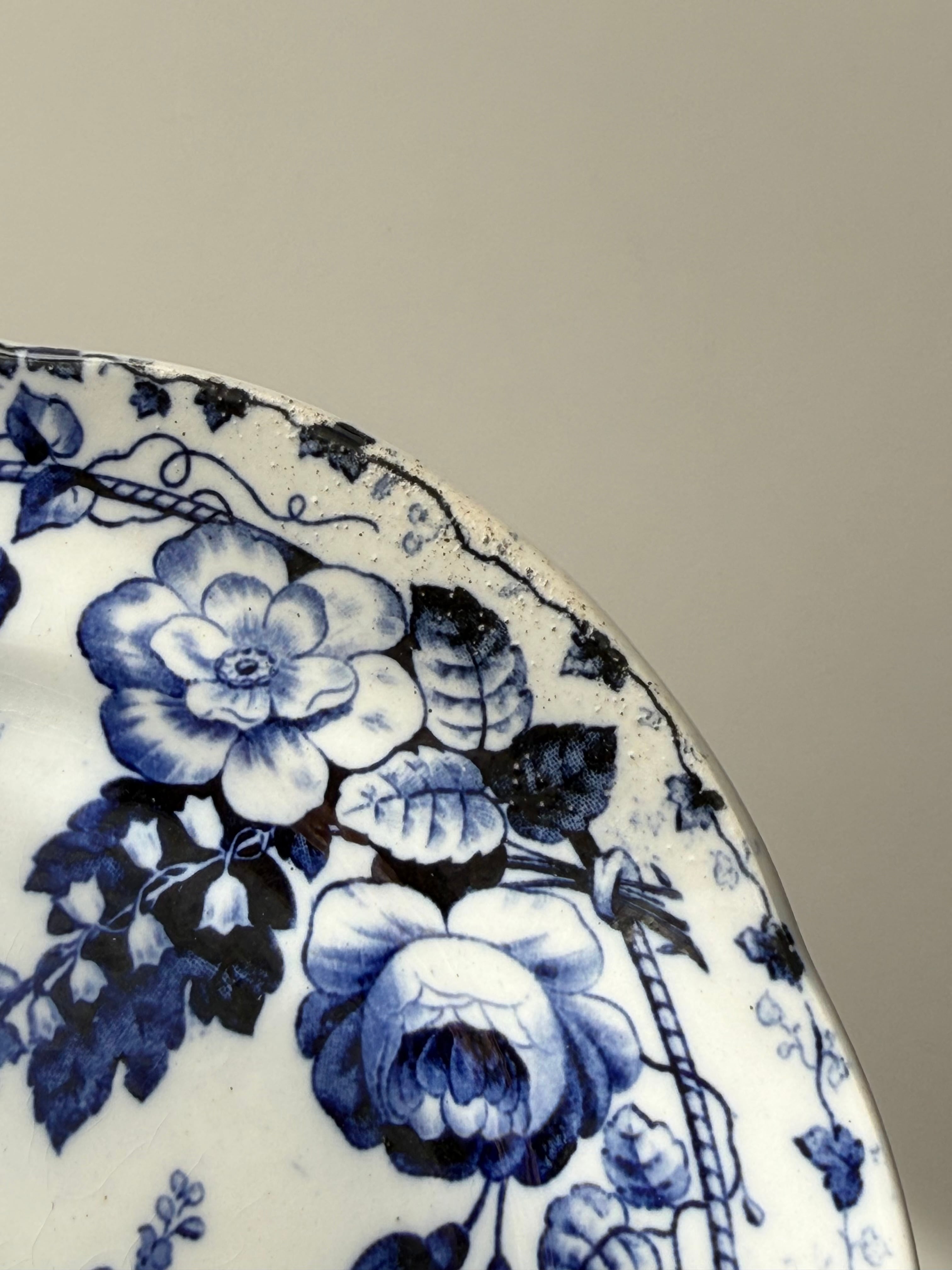 深いコバルトブルーで描かれた花々が、白地の余白に美しく映える1枚です。